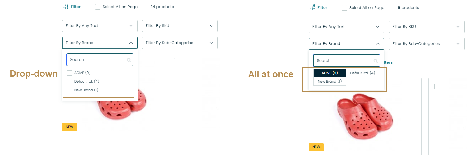 In the Filter Settings section, specify how the multi-select filters should look in the storefront. Available options are Drop-down and All at once.