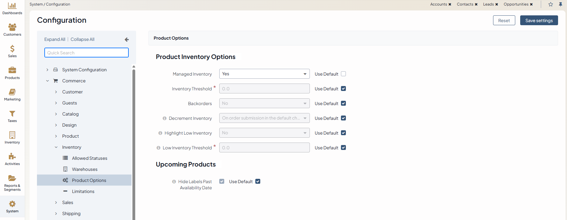 To customize both inventory and upcoming products options, clear the Use Default checkbox next to the option and select the required value.