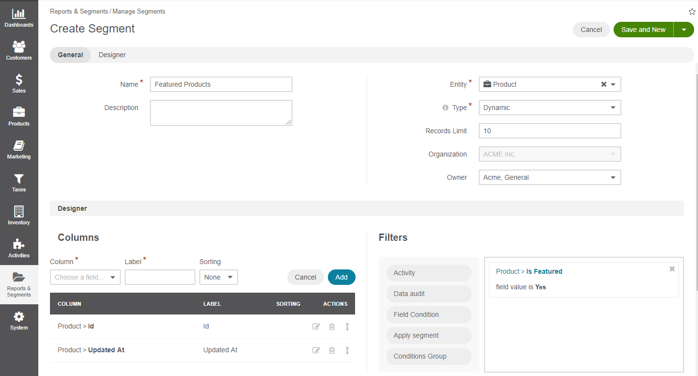 Create a featured product segment under Reports & Segments > Manage Segments as described in the Create Segment topic.
