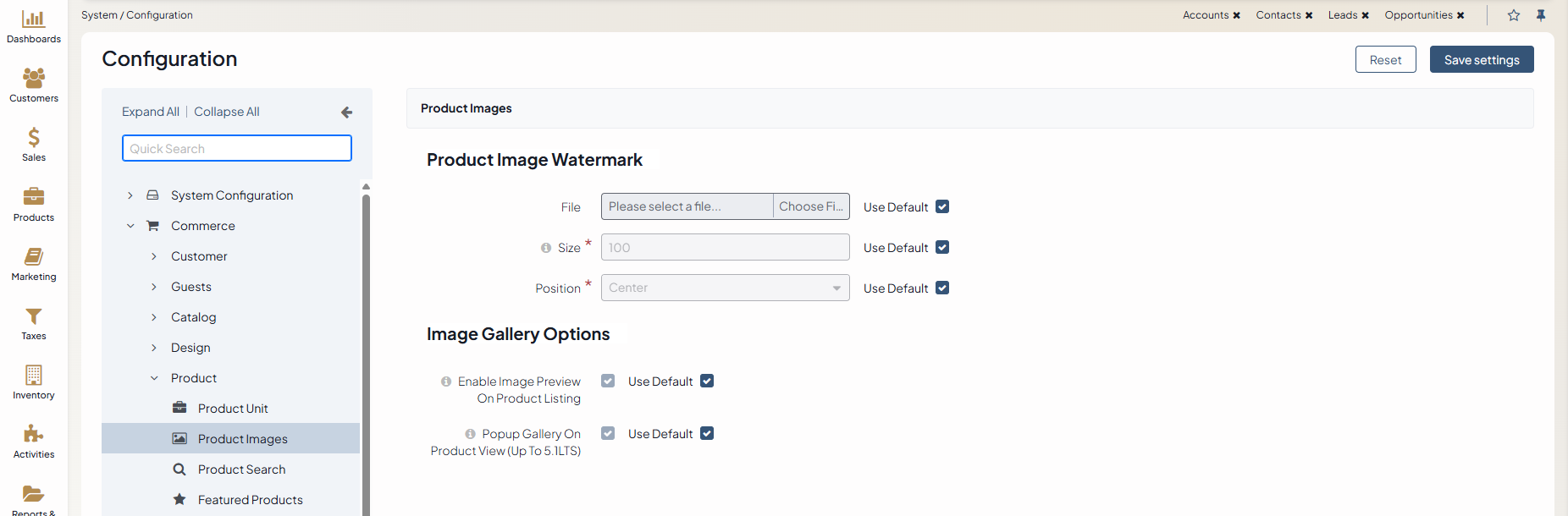 On the Product Images configuration page, you can control the way images are previewed on product listing pages and configure whether to use popup or inline view for the image gallery.