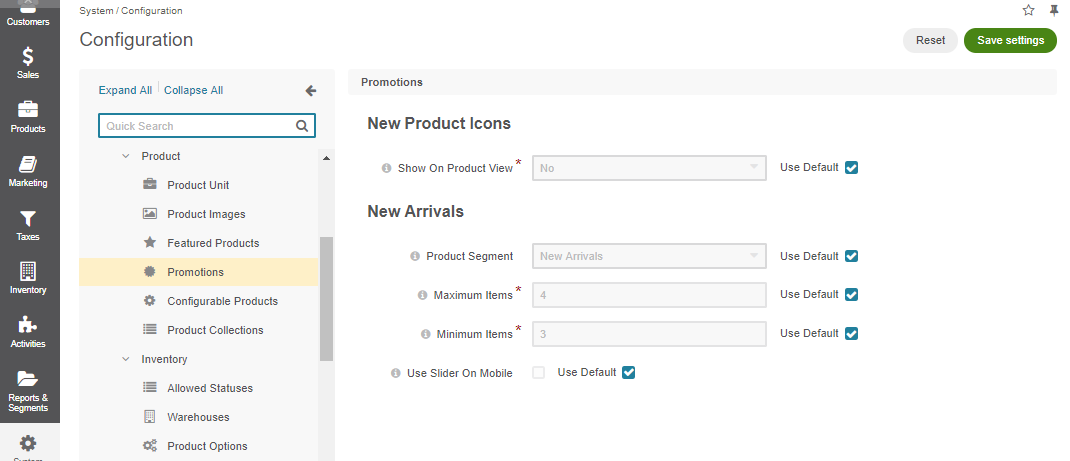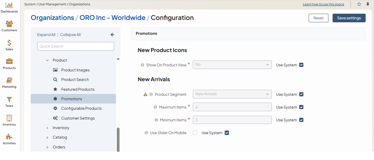 The configuration applies to OroCommerce version 5.1 and below and is retained in the current version only for legacy backward compatibility. For v6.0 and above, please configure this option via the product segment content widget under Marketing > Content Widgets following the new configuration logic.