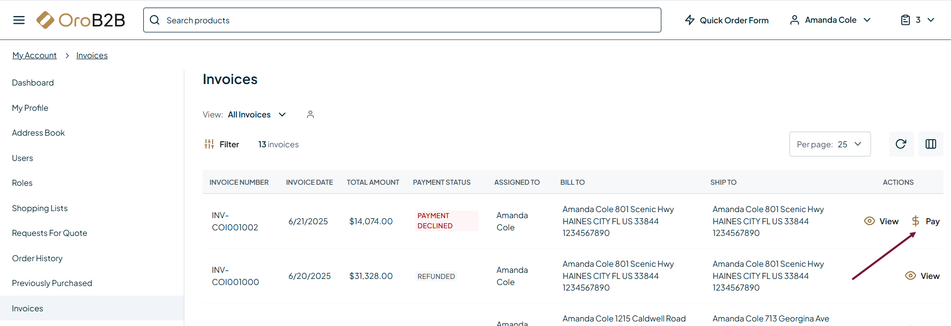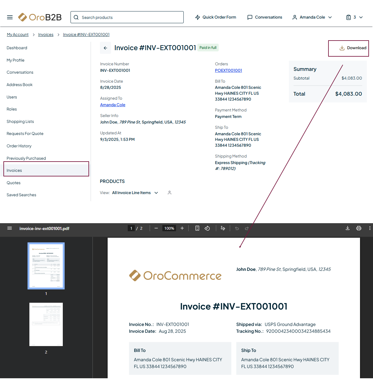 The Invoices feature enables customer users to view, download, and pay invoices directly in the OroCommerce storefront. In the back-office, administrators can access and manage invoice records. The feature supports one-click payments for individual invoices. It also provides the ability to import and manage invoices generated by external systems within the OroCommerce interface.