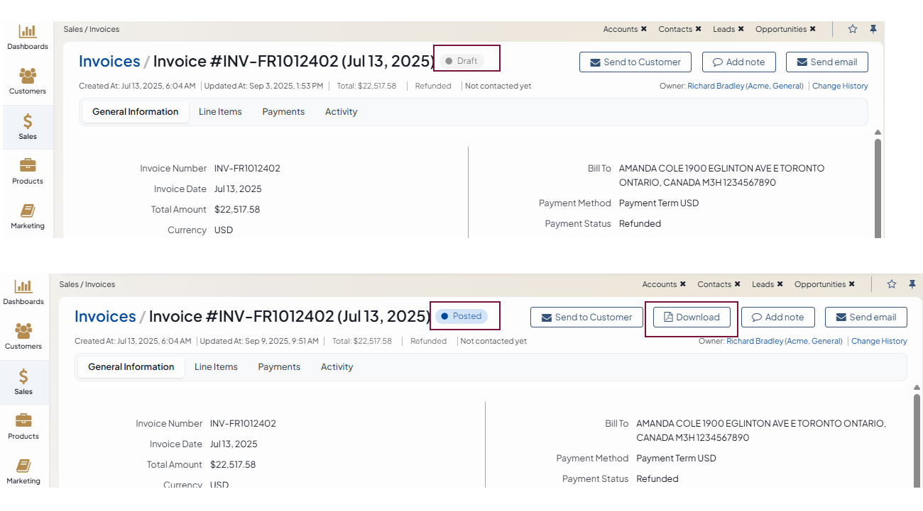 Generate PDF When Invoice Becomes Posted — Enable the option to generate a PDF file when the invoice is marked as Posted. Once created, the PDF will not be re-created, even if the invoice is modified later.