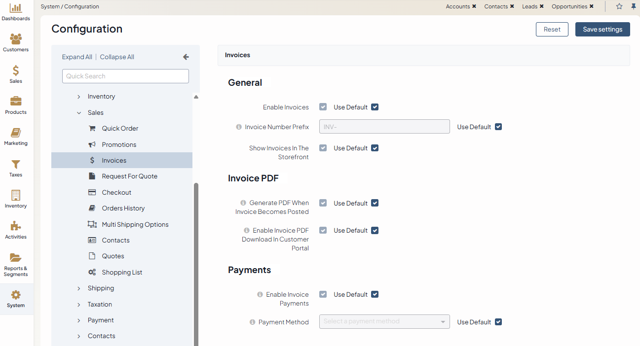 Enable Invoice Payments — Enables or disables the invoice payment functionality system-wide. When enabled, a Pay button is displayed in the storefront, and a Payments section is added to the invoice view page in the back-office.