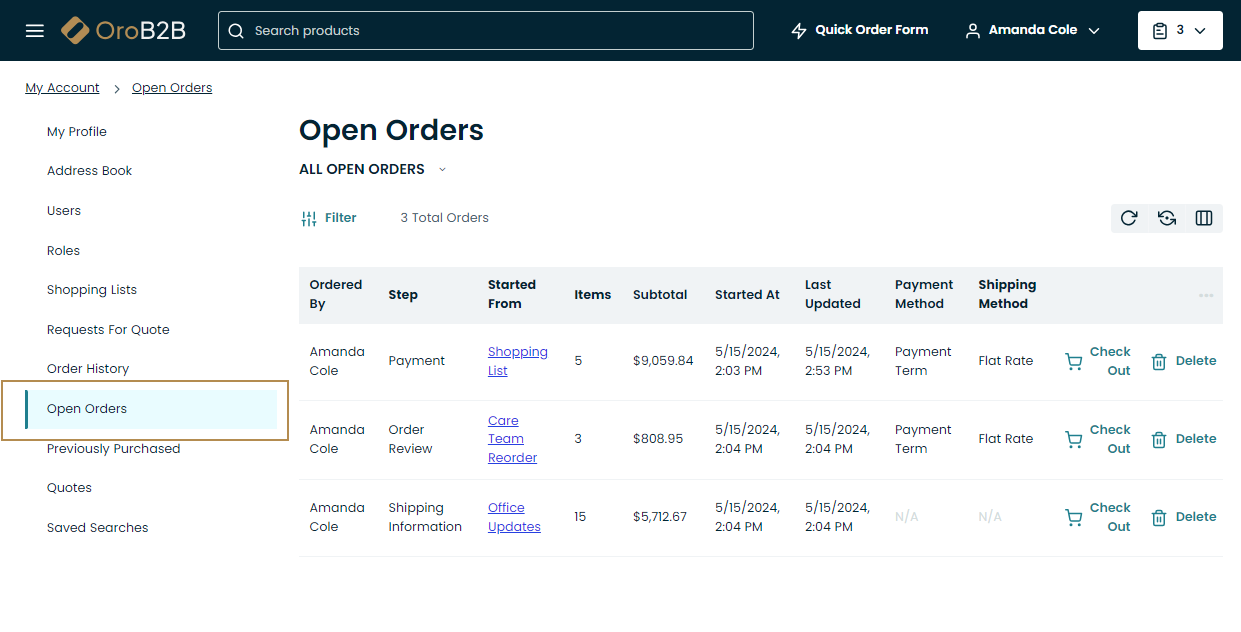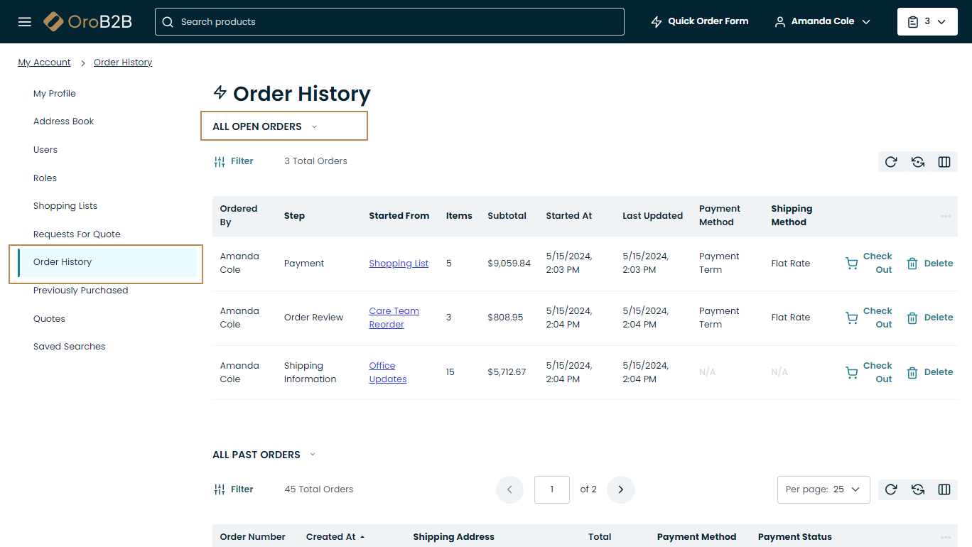 You can define whether to display open orders within the Order History menu in the storefront, or as a separate Open Orders menu item. This setting can be configured globally, per organization, and per website: