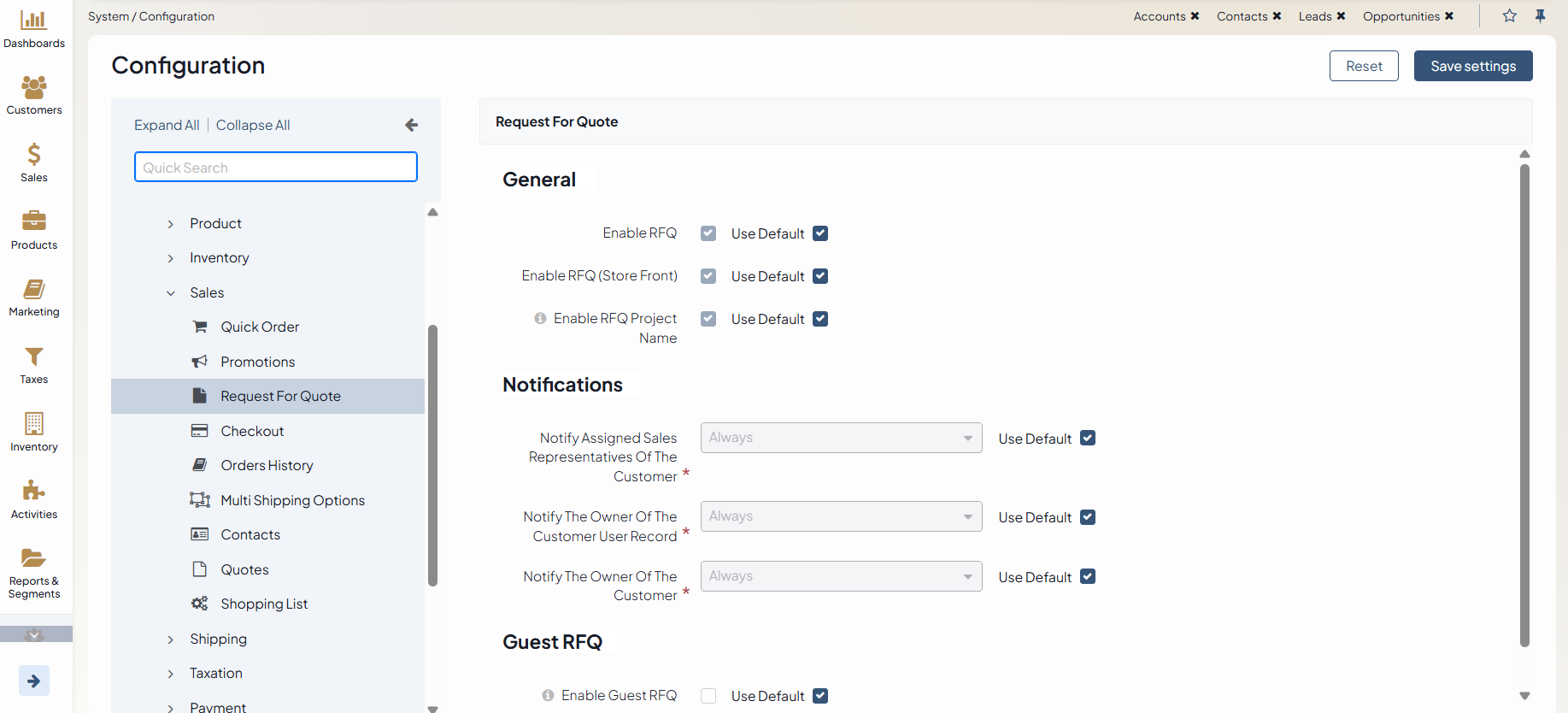 On the RFQ configuration page, you can enable RFQ feature for the back-office and storefront, control RFQ Notification options and Guest RFQs.