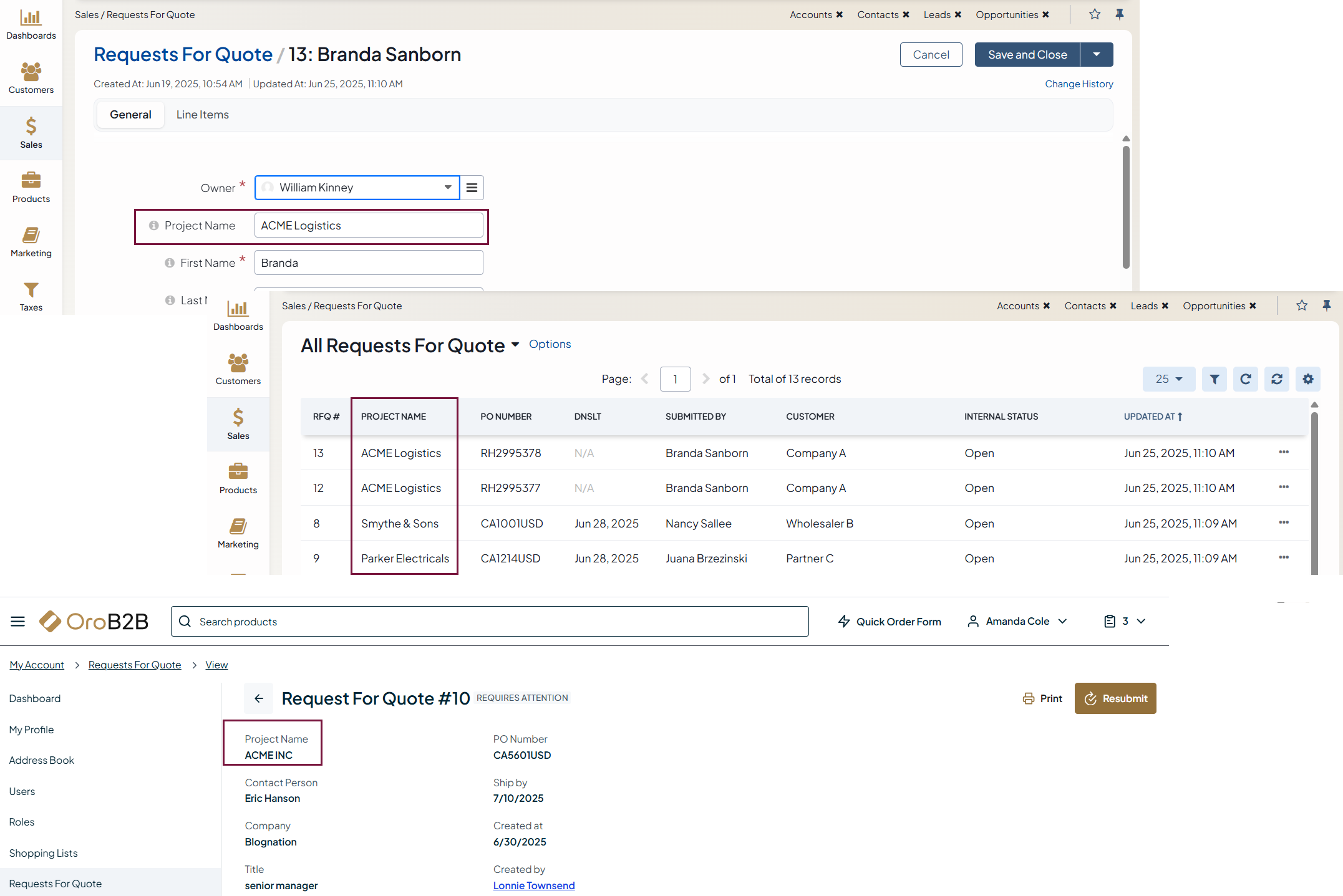The Enable RFQ Project Name feature was introduced in OroCommerce versions 6.1.3 and 6.1.4.