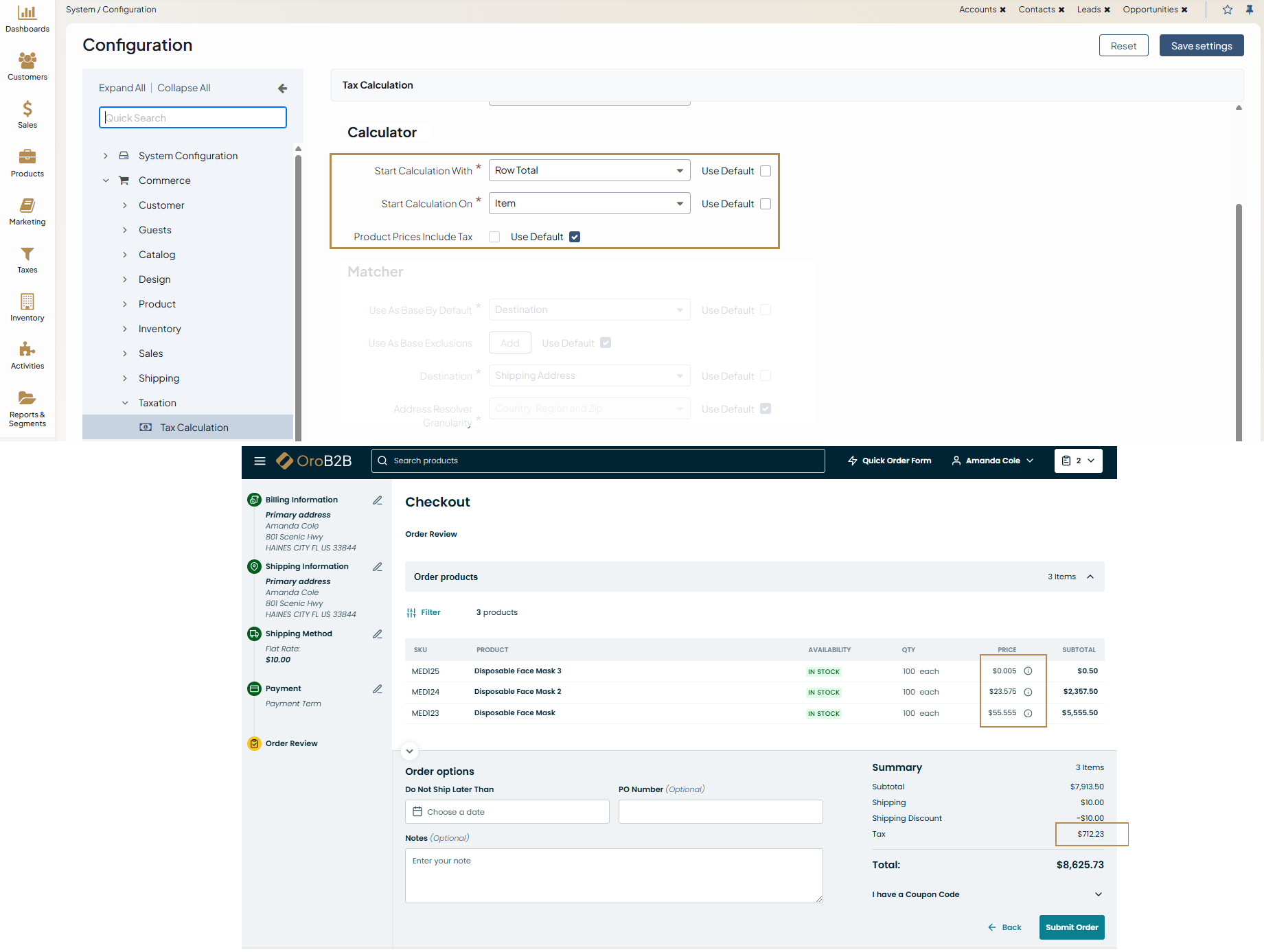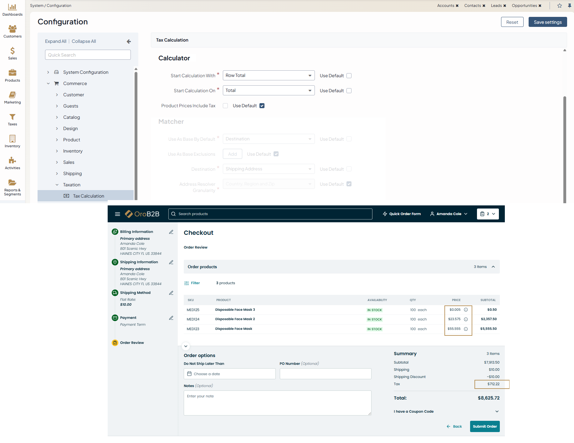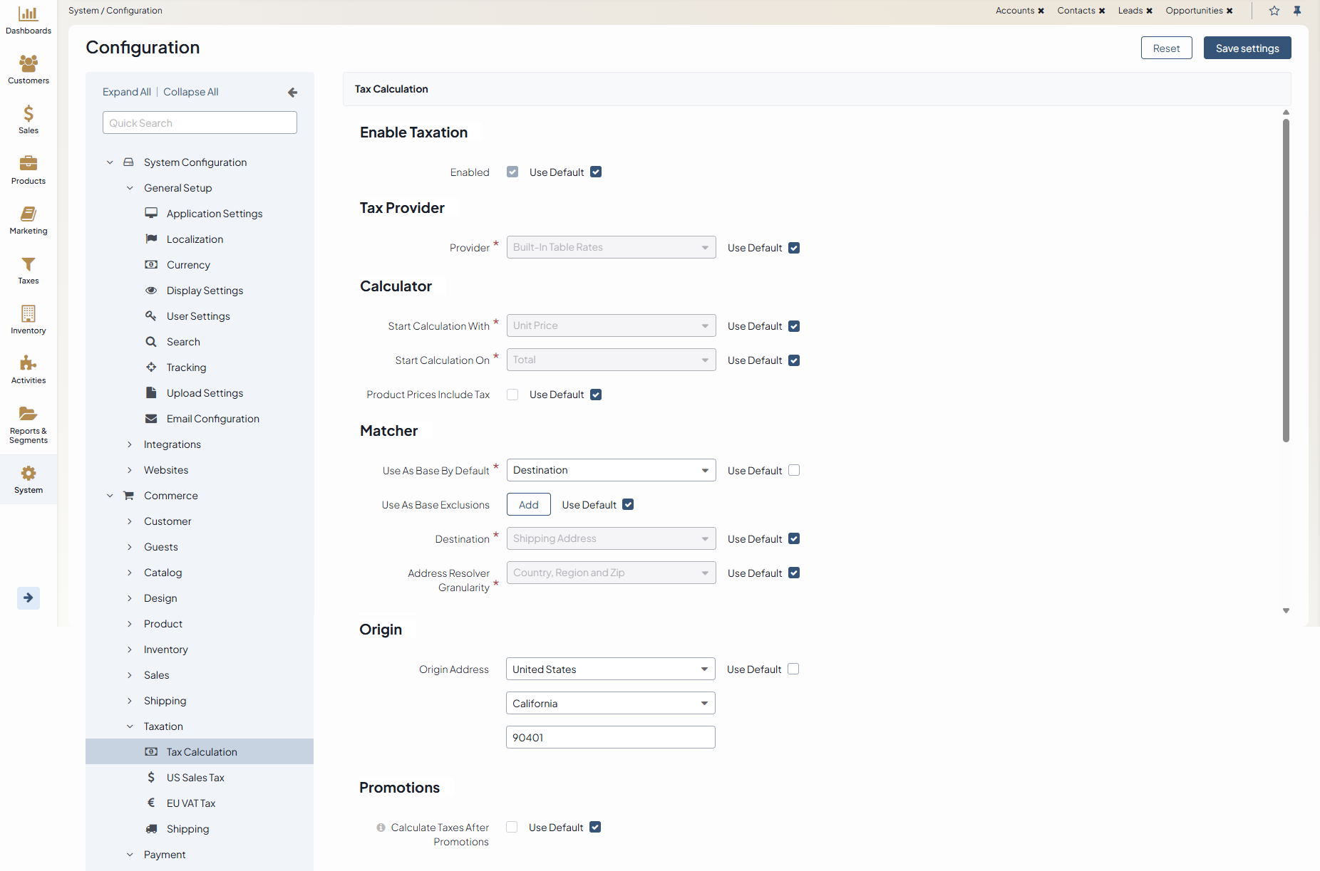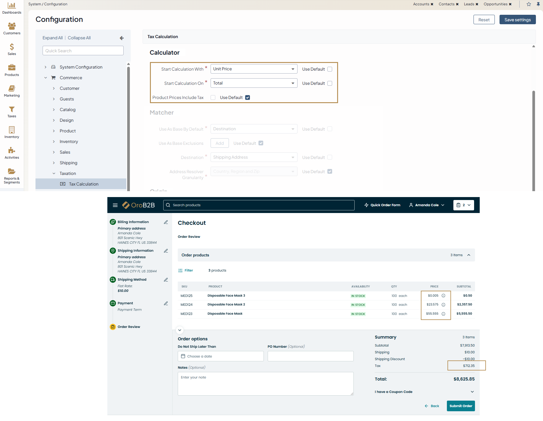 To customize the following tax calculation settings that impact the way OroCommerce implies tax to orders, perform the following steps: