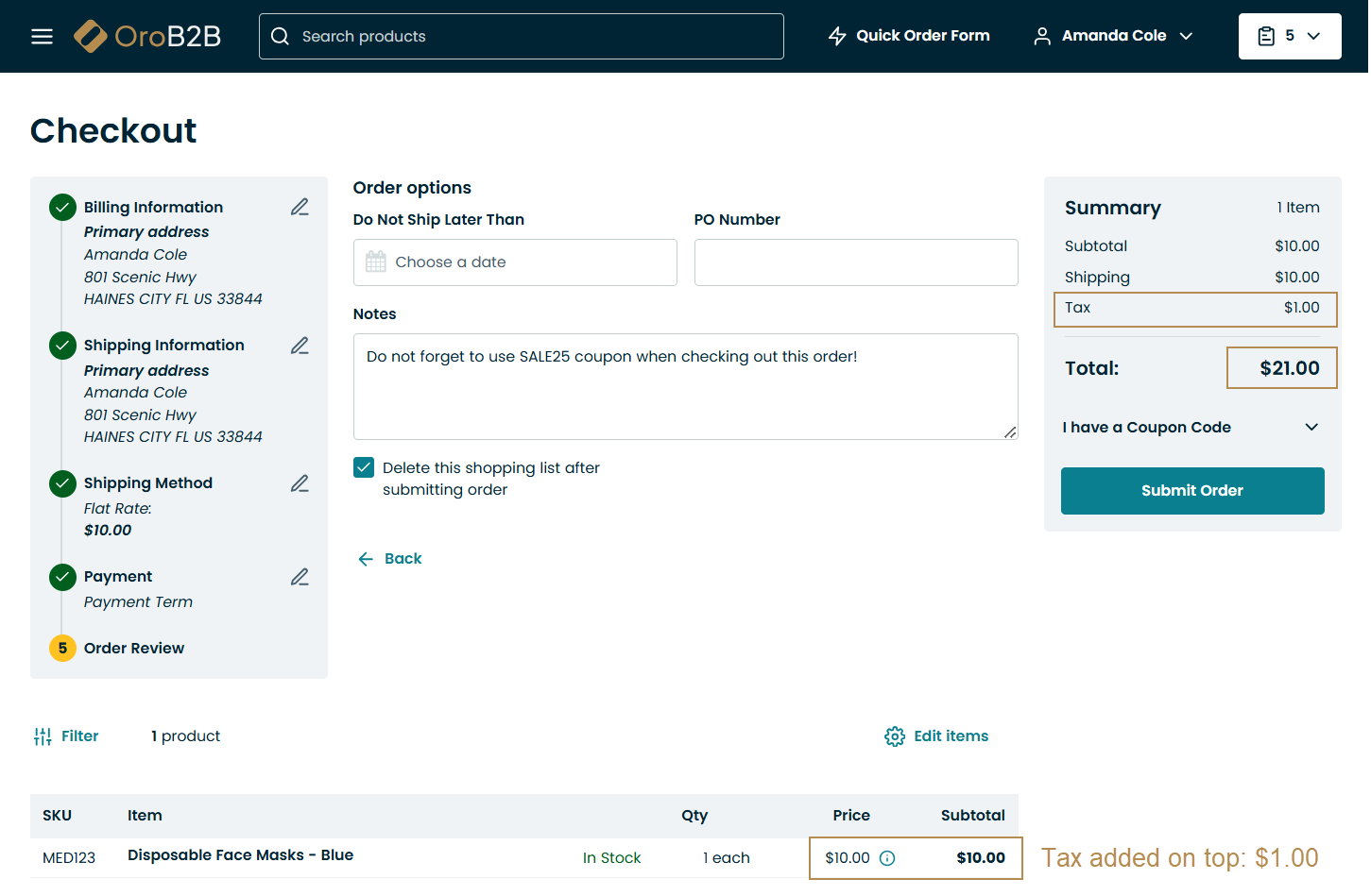 When product prices do not include the tax amount, the tax is calculated and added on top during checkout based on the Start Calculation With and Start Calculation On settings described previously. In our case, the product price is listed as $10.00 (tax-excluded), and the tax rate is 10%; the tax is added on top, increasing the order total.