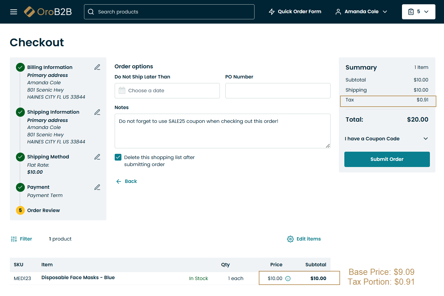 By default, OroCommerce calculates tax using a rate defined in the built-in tax rule for the default shipping origin address.