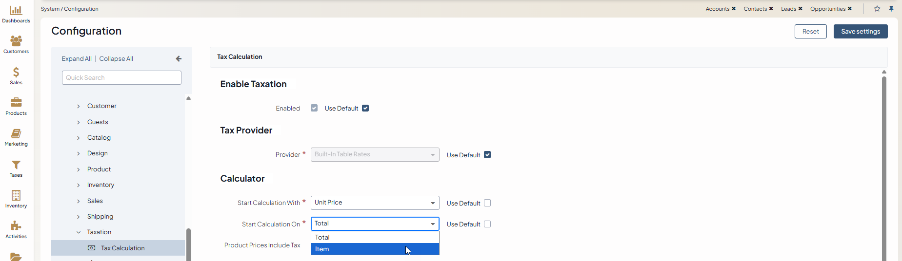Click Reset at the top right to roll back any changes to the tax calculation settings.