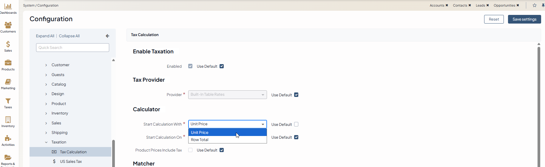 Start Calculation With - The option allows you to specify how taxes should be calculated — either per Unit Price or based on the Row Total (total price for all units of the same product).
