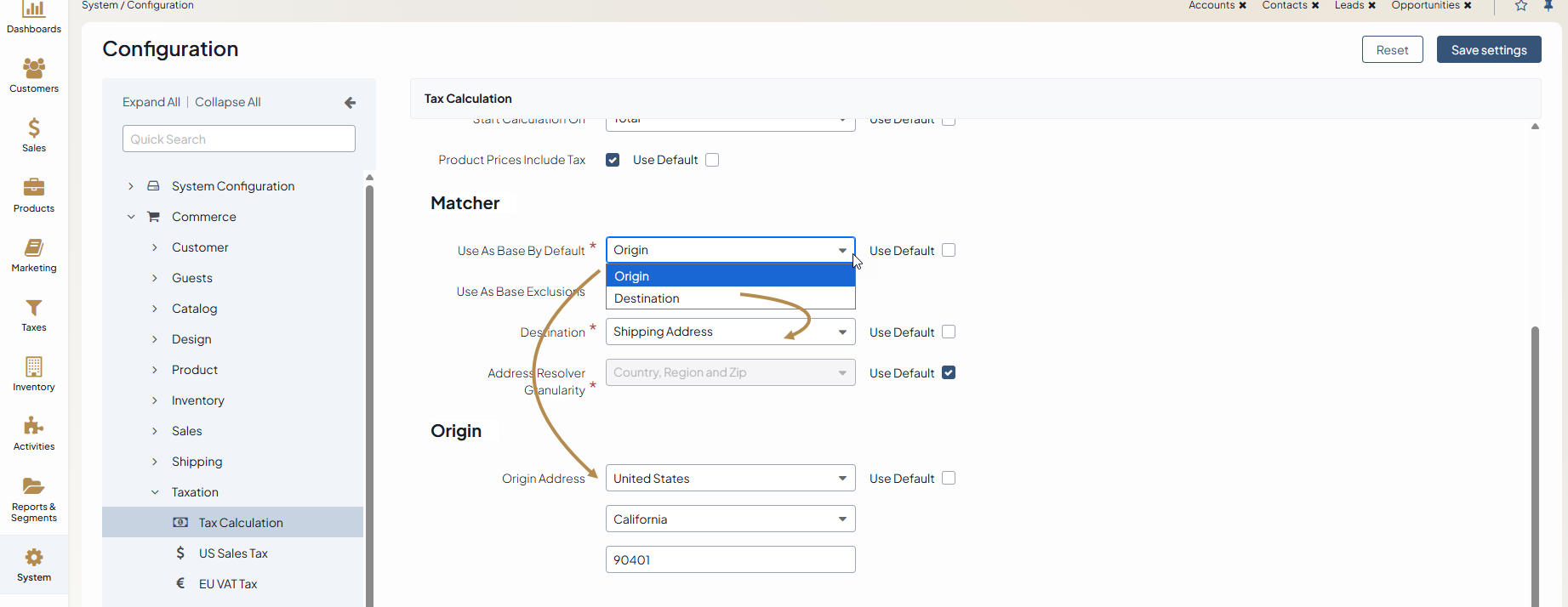 For the origin-based jurisdiction, select Origin and define the default address in the Origin section below.