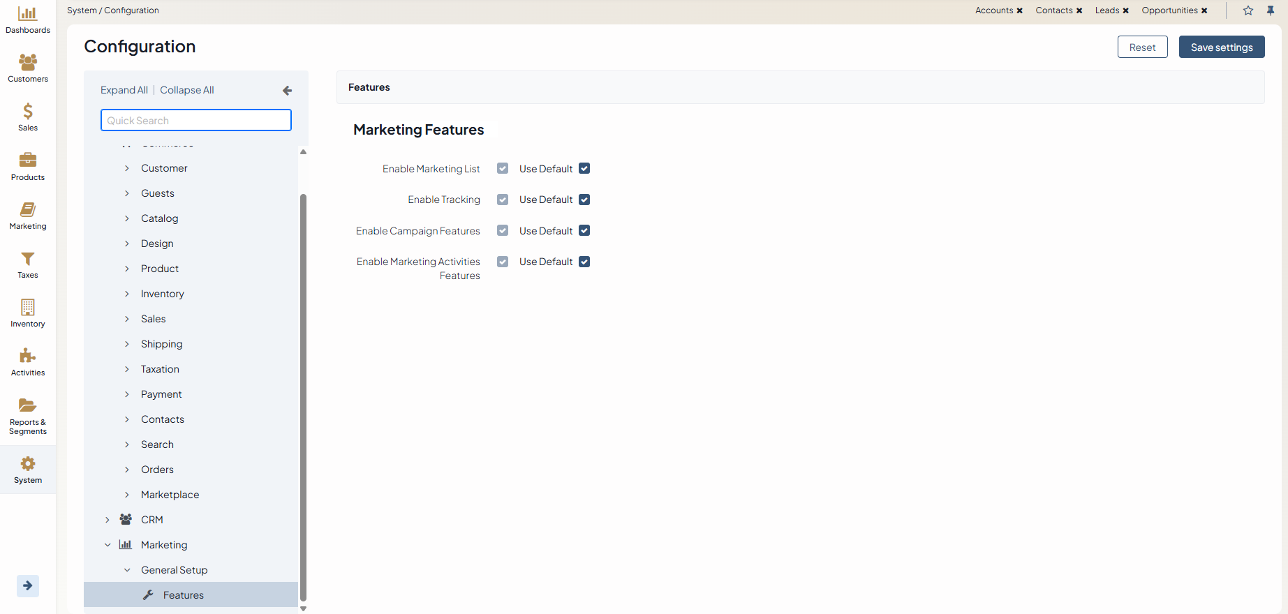You can customize marketing features, such as marketing lists, website tracking, marketing campaigns, email campaigns, and/or marketing activity statistics in context (e.g. for orders, customer users, etc.) in your Oro application via the system configuration.