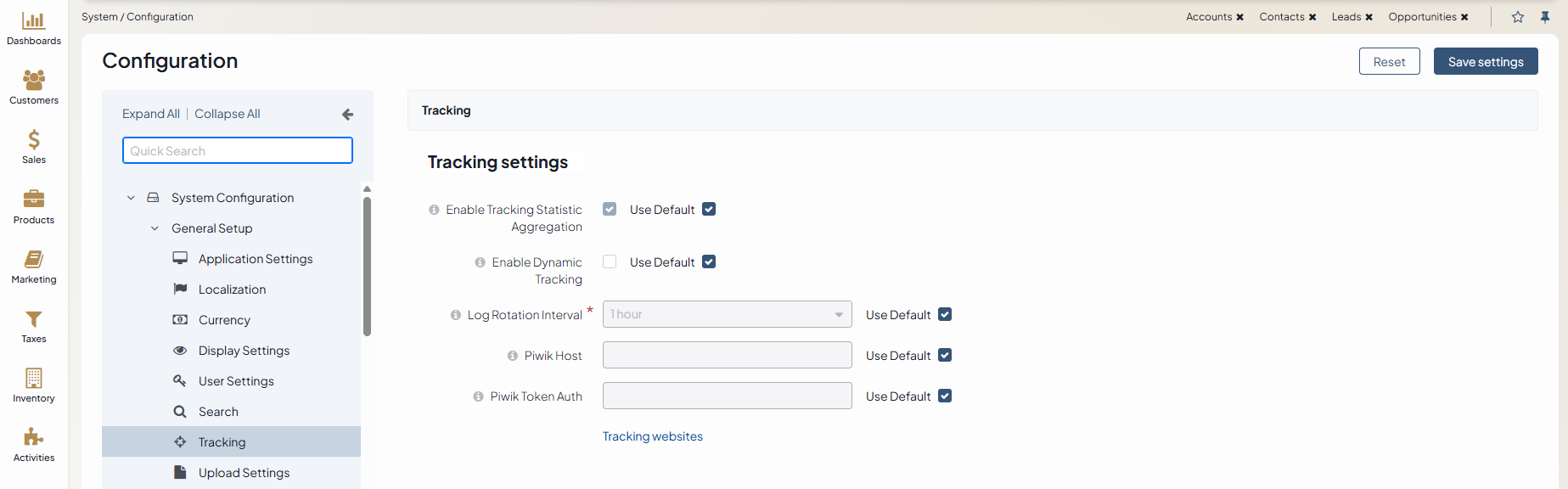 You can set up the settings that apply to all the Tracking records created in the Oro application.