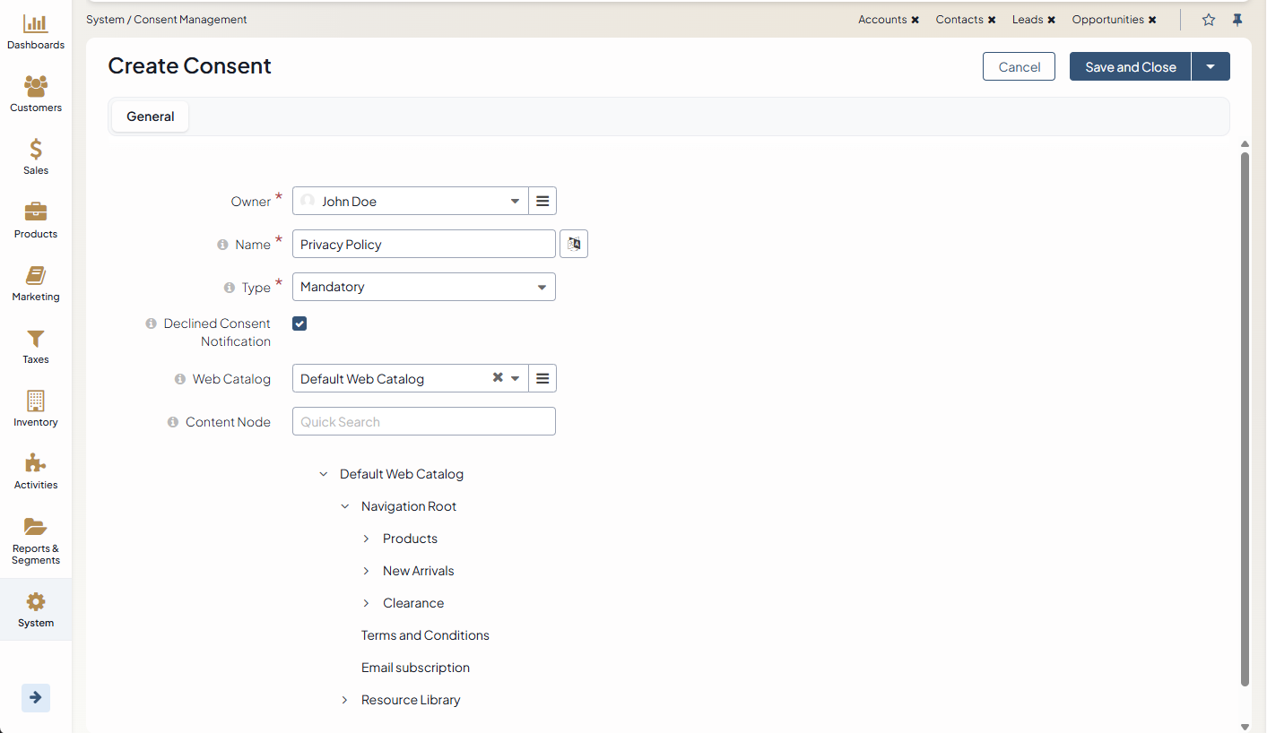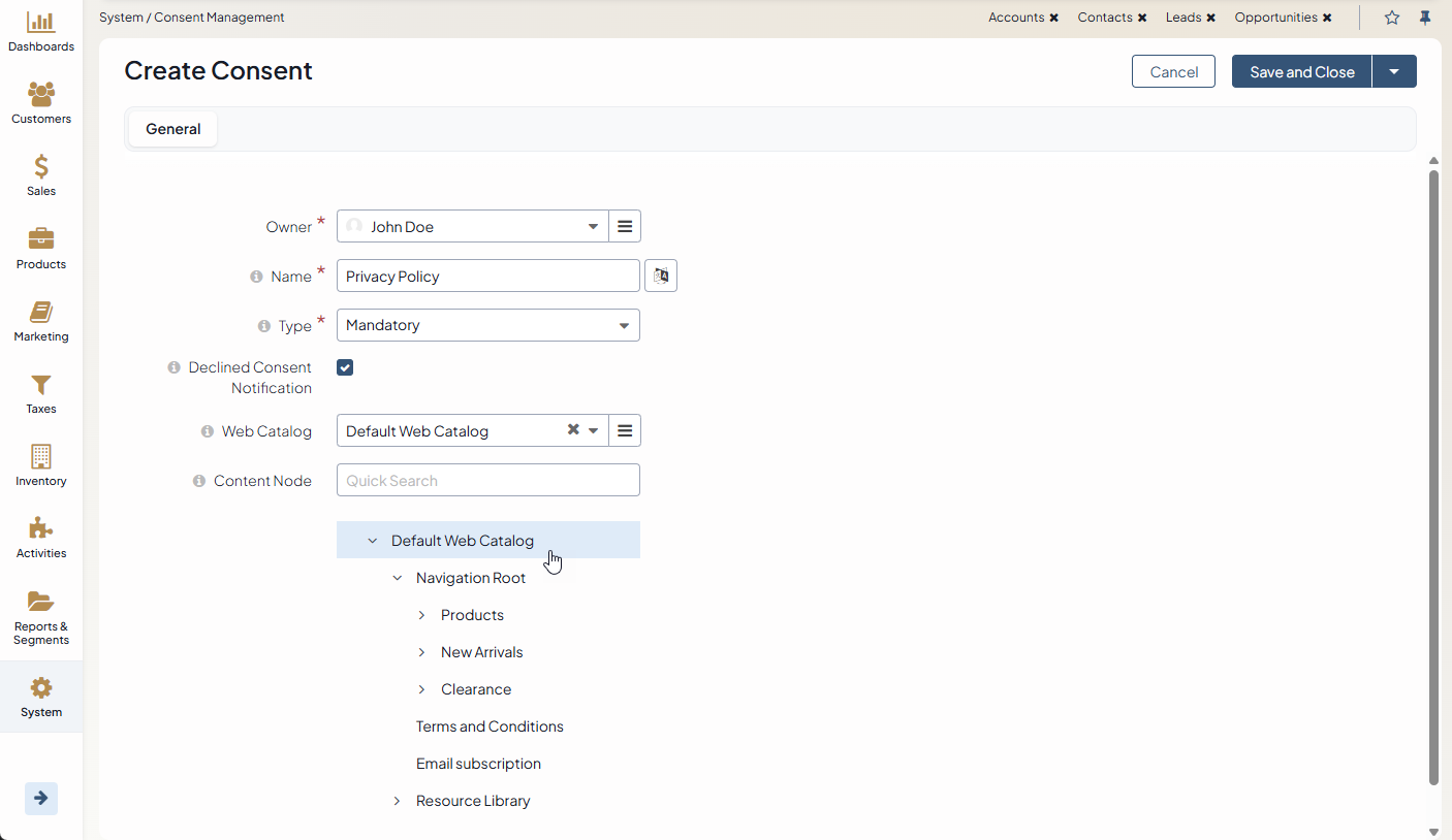 Content Node — Content nodes are added to web catalogs as landing pages, and linked as content variants to the catalog nodes. The selected web catalog node can be configured to display different landing pages (content variants) in different languages. To link the consent to the required node, click on the required node in the tree to select it.
