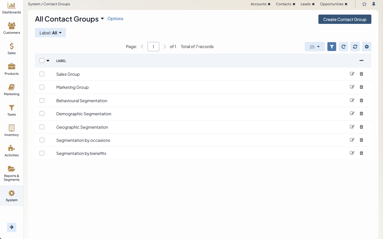 Now, you can edit or delete a contact group from the system by clicking the corresponding icon next to the required row in the grid.