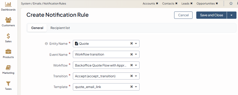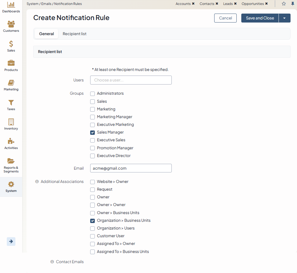 Notification rules define when to send an email to a recipient. For example, you may want an administrator to receive notifications when a user sends them a request, notify users when a new activity is assigned to them, or inform each time customer details are edited.