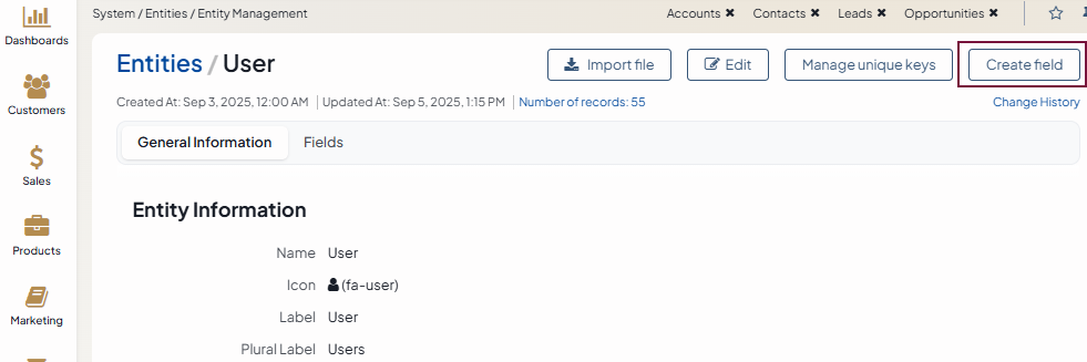 Fields are used to store details of entity records. For example, a ‘street name’, a ‘zip code’, and a ‘building number’ may be fields of an ‘address.’ You can add new fields to any extendable system entity.