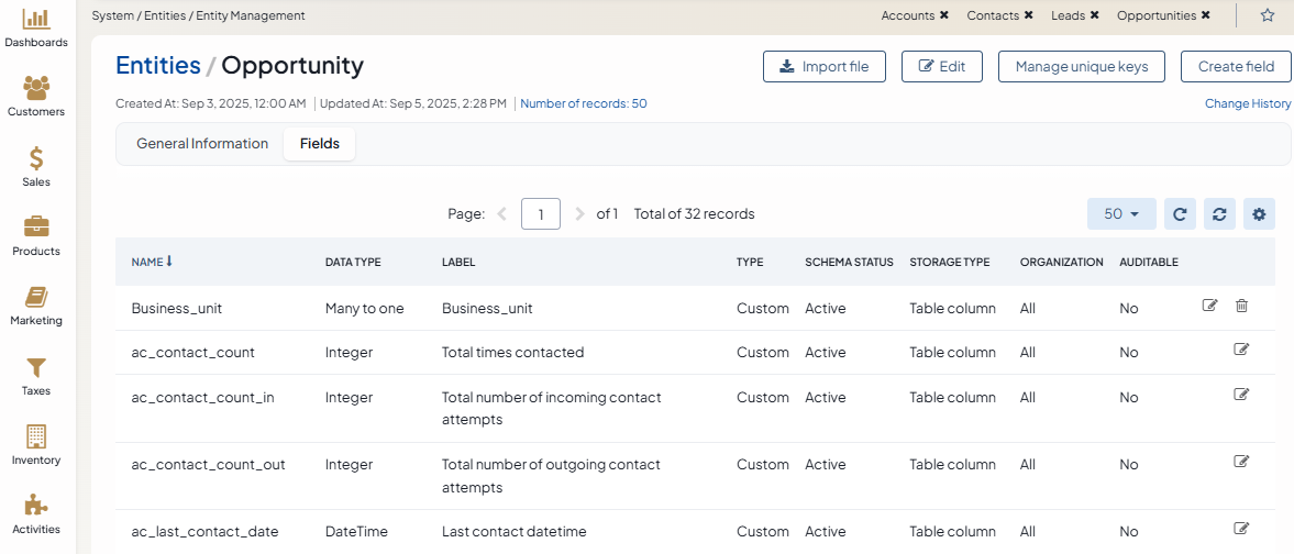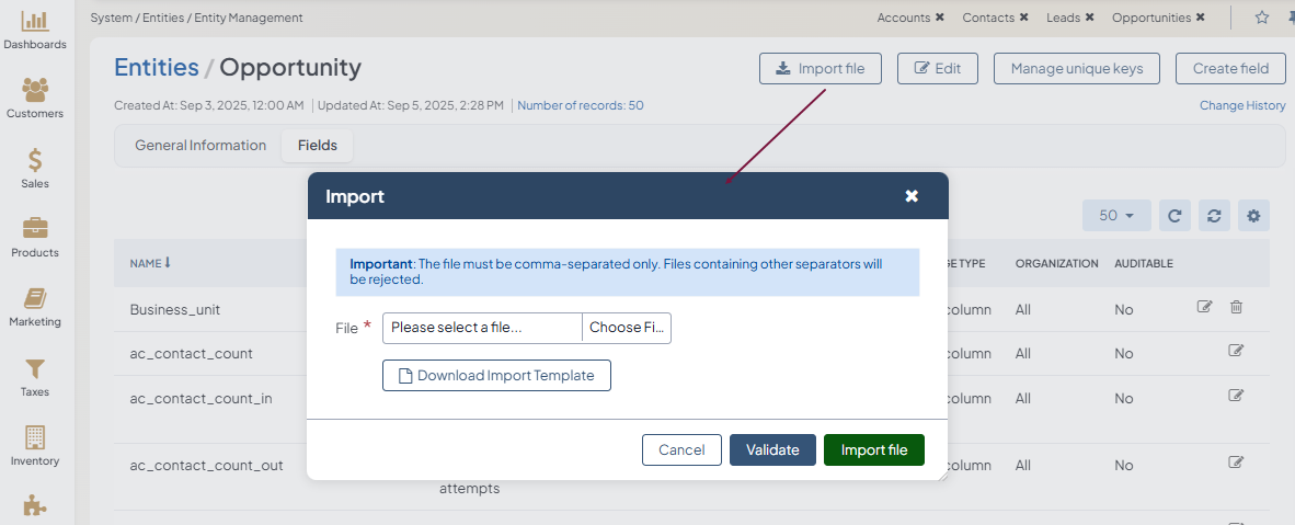 To simplify creation of entity fields, you can import a .csv file with a list of properties and their fields.
