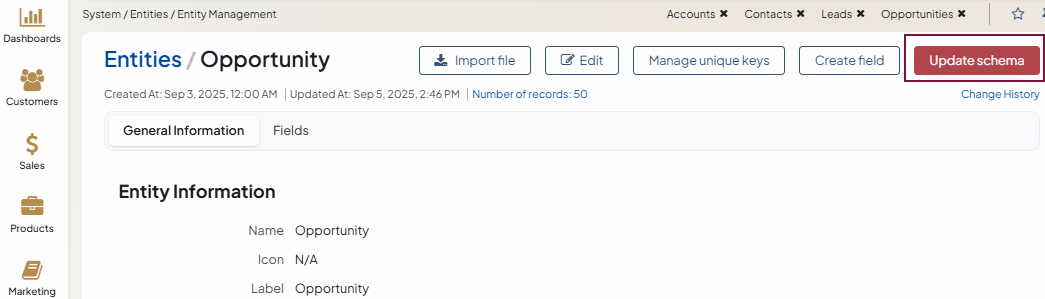 In your Oro applications, you can manage the already existing and newly added entity fields. Specifically, you can edit and delete them, as well as import fields in bulk. To make sure that the new or updated fields are successfully added to entities, you update the schema.