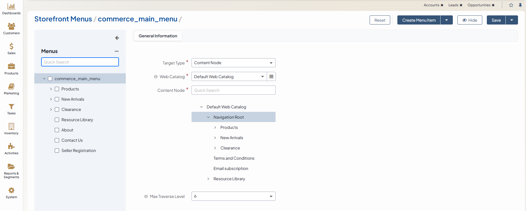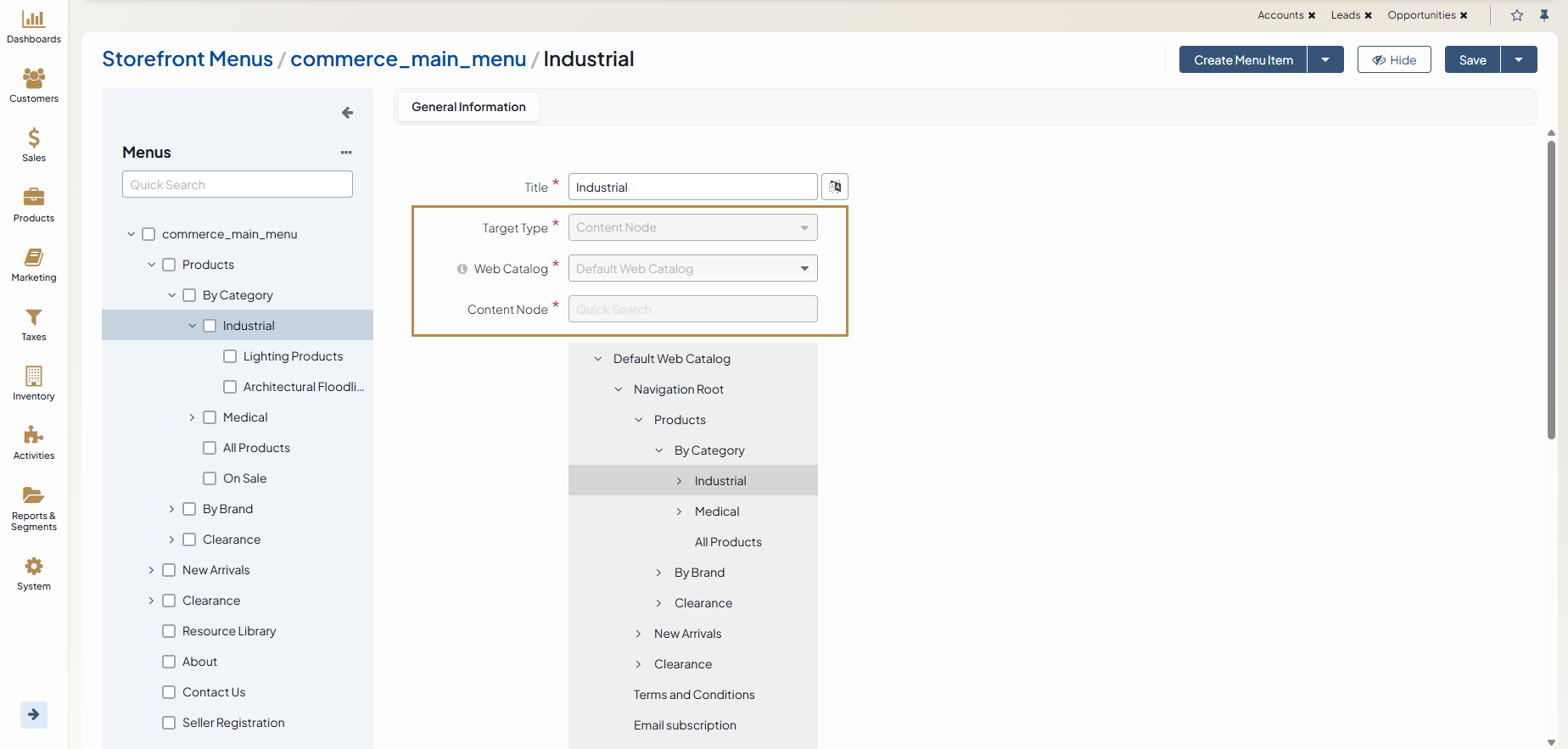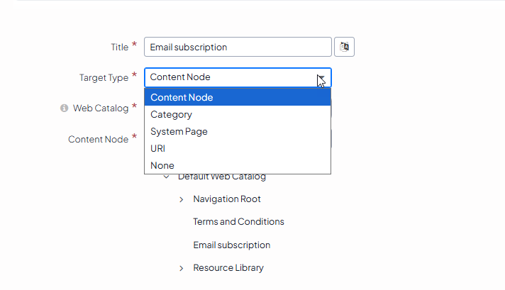Select the web catalog from which you want to choose the content node and the content node itself. For more information on how to use the content node type to update the main menu on the website, see Changing Storefront’s Product Menu.