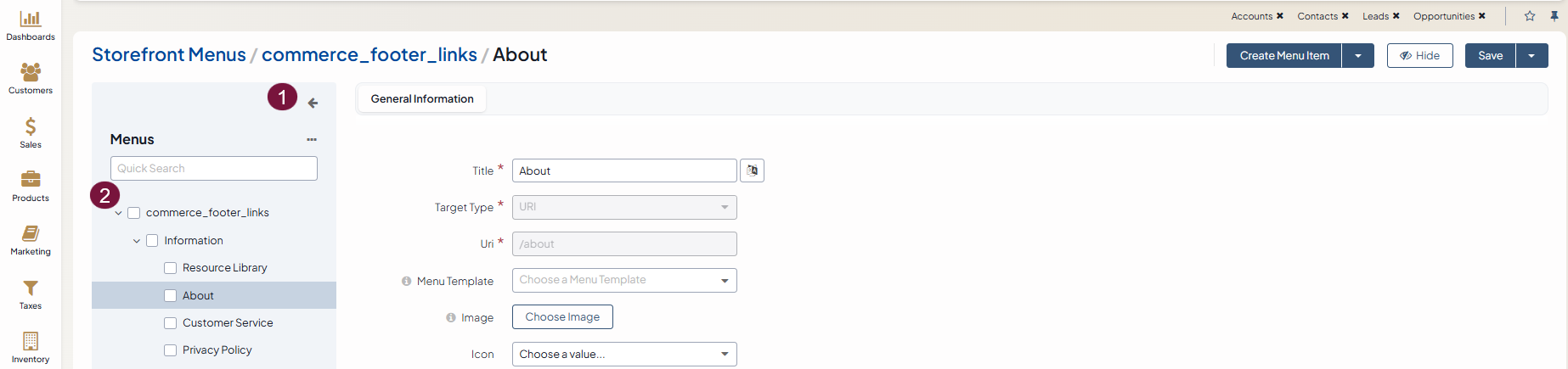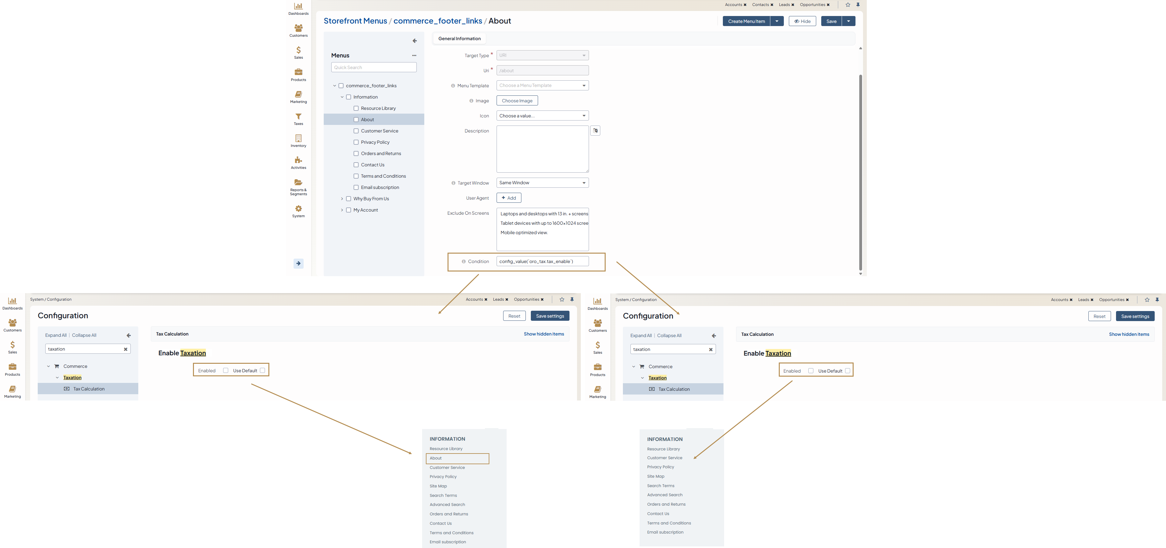 As an example, let us make the About section in the storefront visible to customers with configured taxes. For this, we need to: