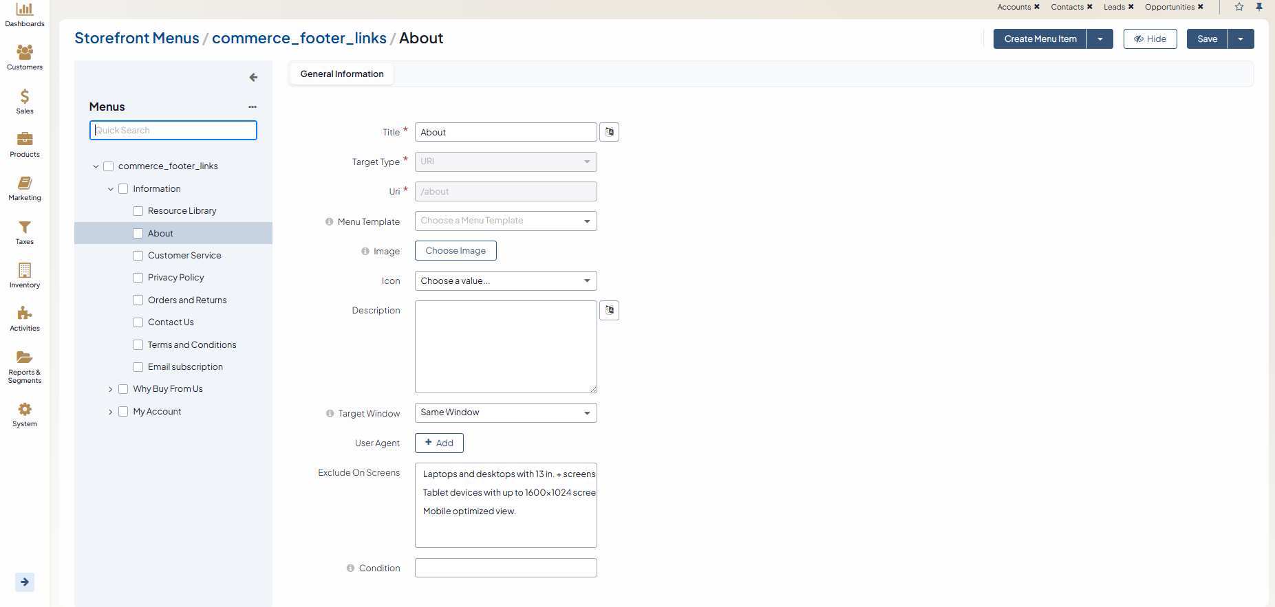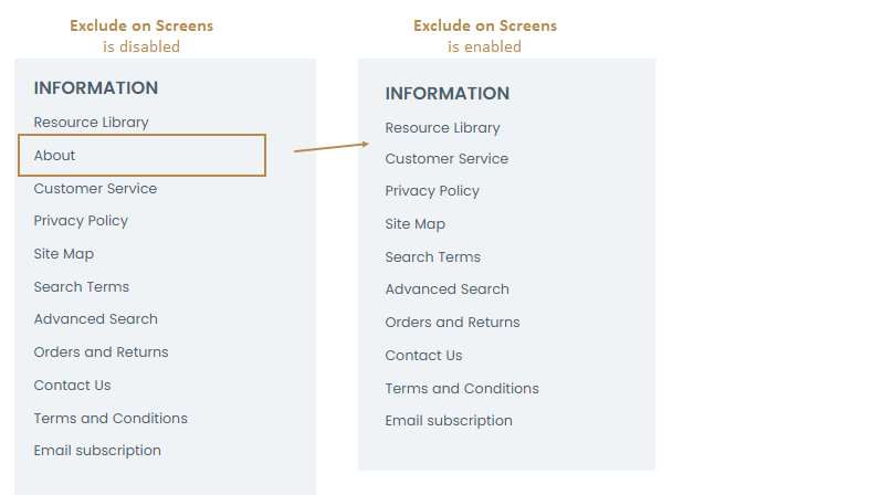 Exclude On Screens — Enables you to hide the menu items on the specified screen sizes by clicking any screen size and selecting the one for which the menu will be hidden from the customer. Hold Ctrl and click the value to select/deselect multiple screens.