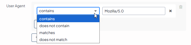 The contains operation determines whether the specified substring is included in the user agent string (e.g., if you mention Mozilla, all the versions of Mozilla in the user agent string will meet the requirements of this function).