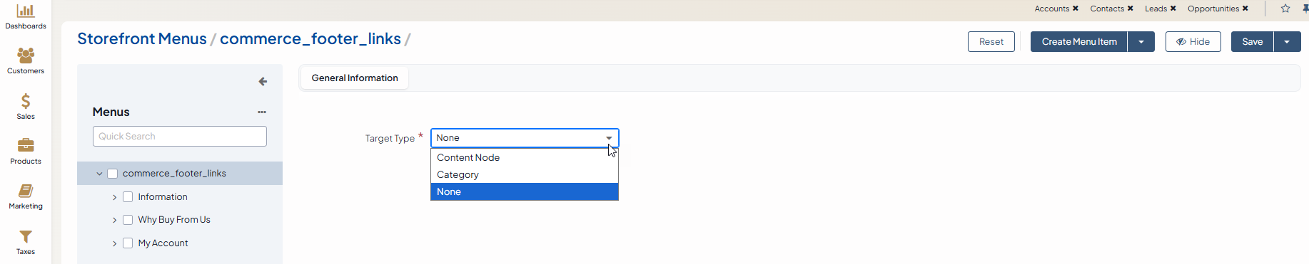 To update the target type of the root menu item of any storefront menu, click on the menu item, and select one of the three options from the dropdown: