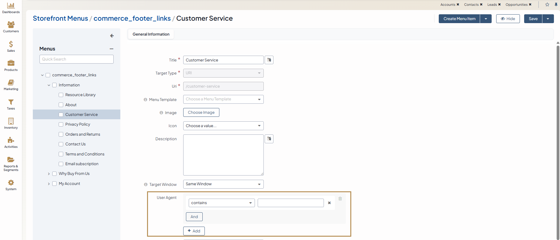 User Agent — A unique agent to every customer. It reveals a catalog of technical data about the device and software that the customer is using. You can control whether to show or hide some menu items from the customer by proceeding with the following steps: