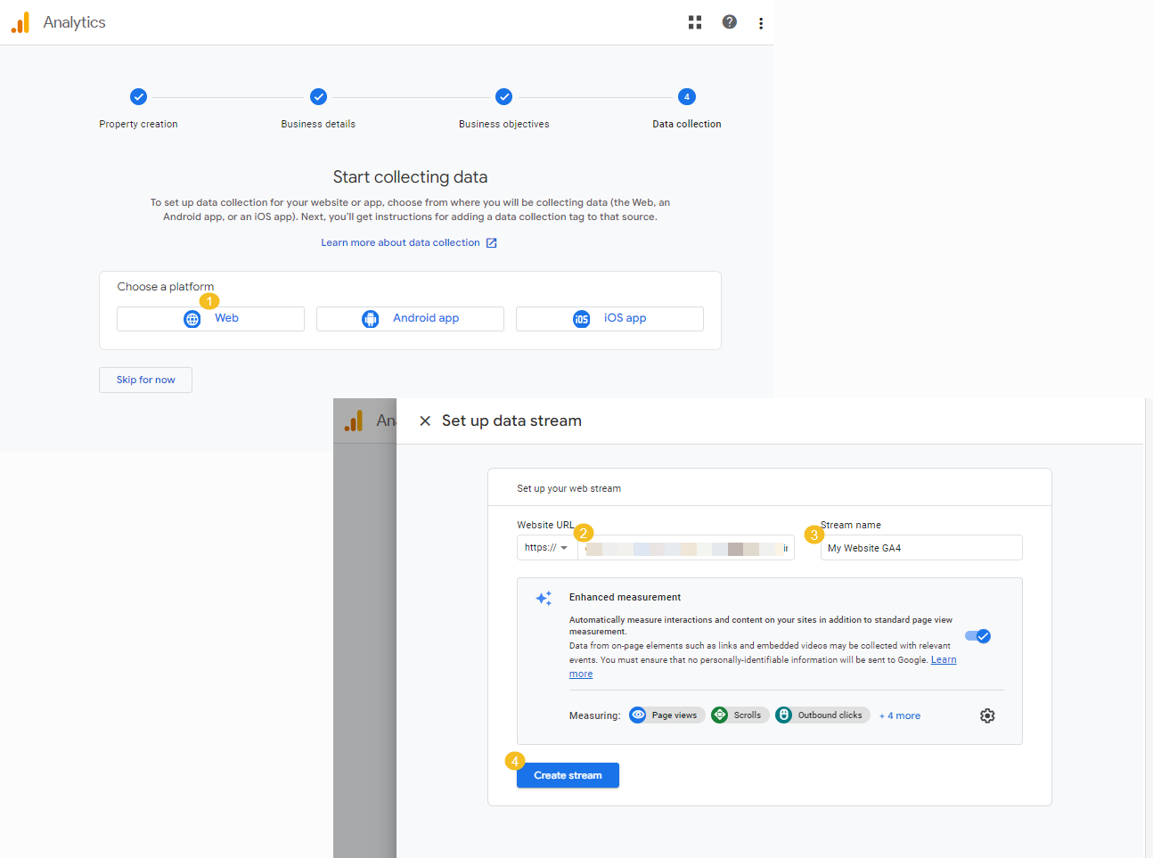 For Web, provide the URL of your website (e.g., “mywebsite.com”) and a stream name. Click Create stream.