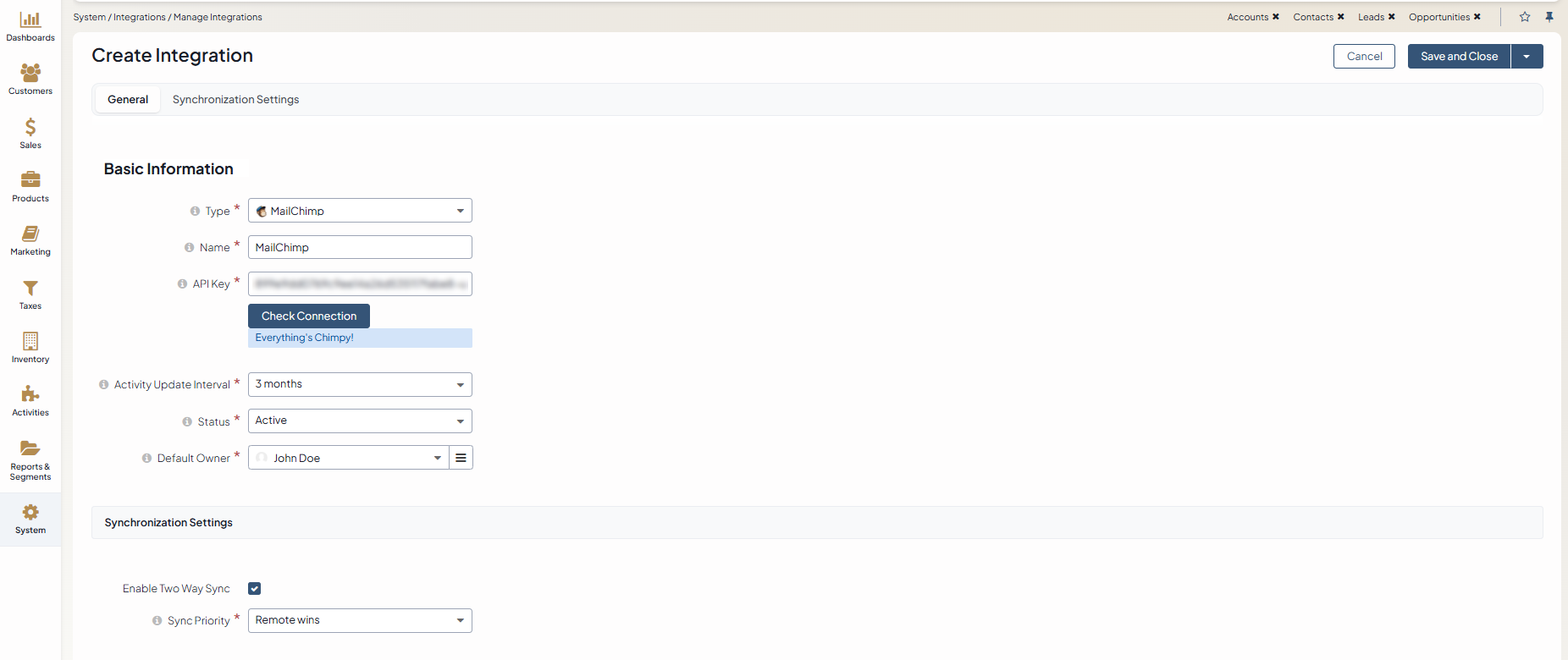 The Owner determines the list of users who can manage the integration and the data synchronized with it. This means that the owner receives the data produced by the email campaign. All Entities imported within the integration will be assigned to the selected user. It is suggested to select a marketing rep as the owner.