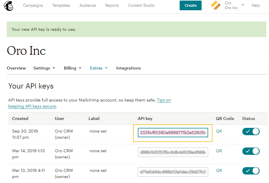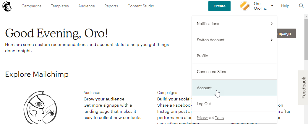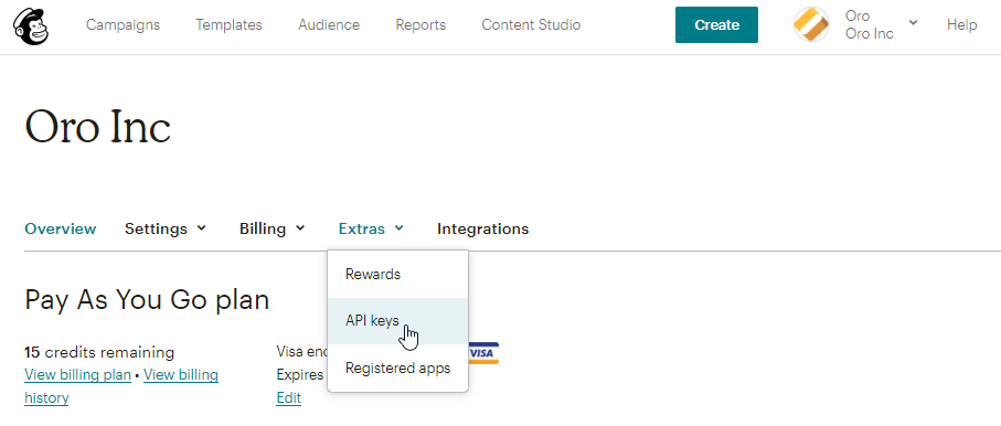 To configure the integration with Oro application on the Mailchimp side, you need to create an API key. To do that: