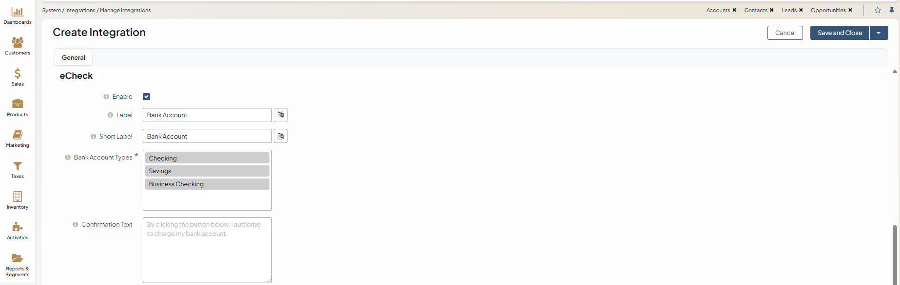 Confirmation Text — The confirmation text provided in this field is displayed to the user when they choose eCheck as a payment option.