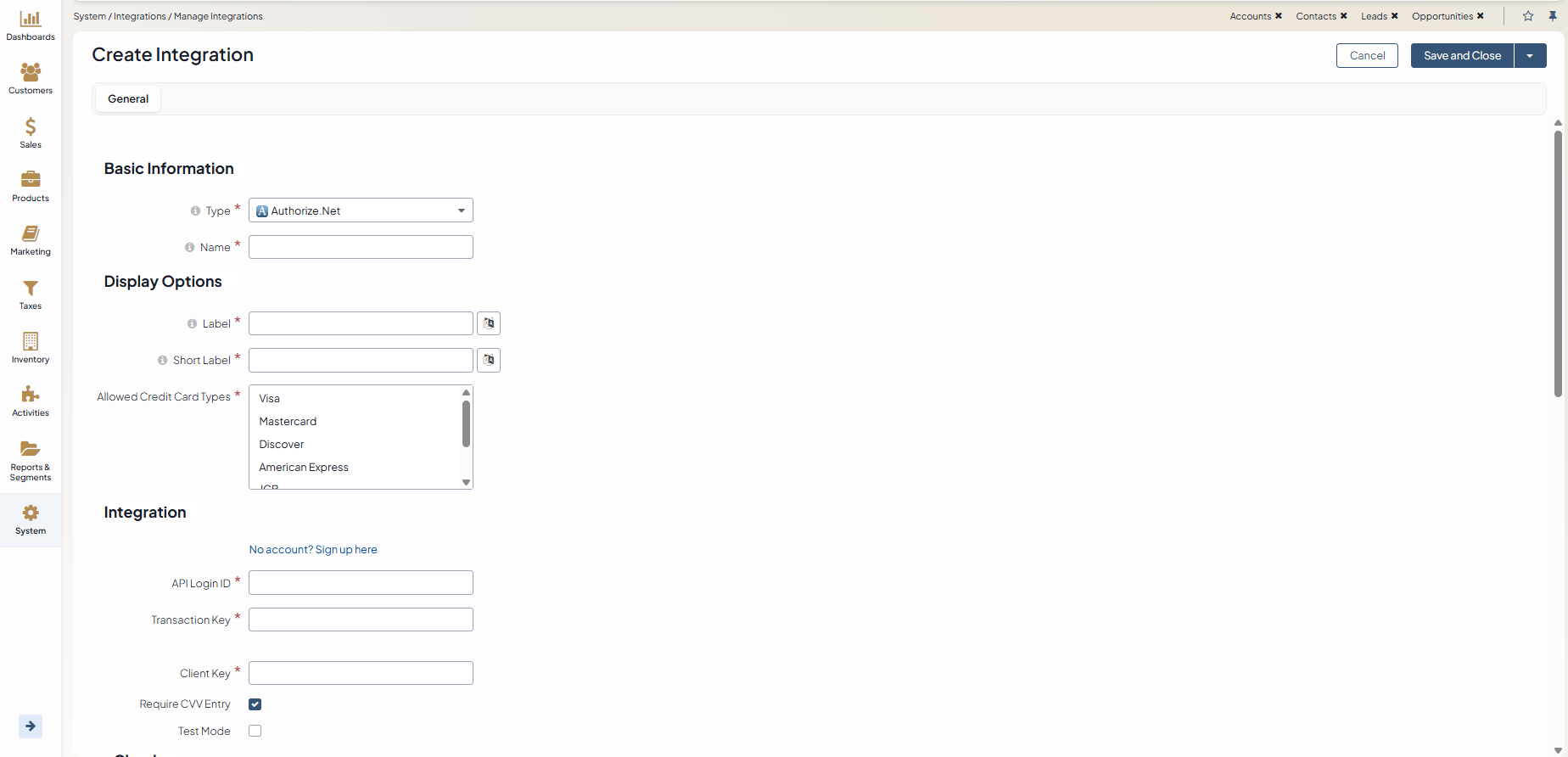 To set up integration with Authorize.Net, complete the following: