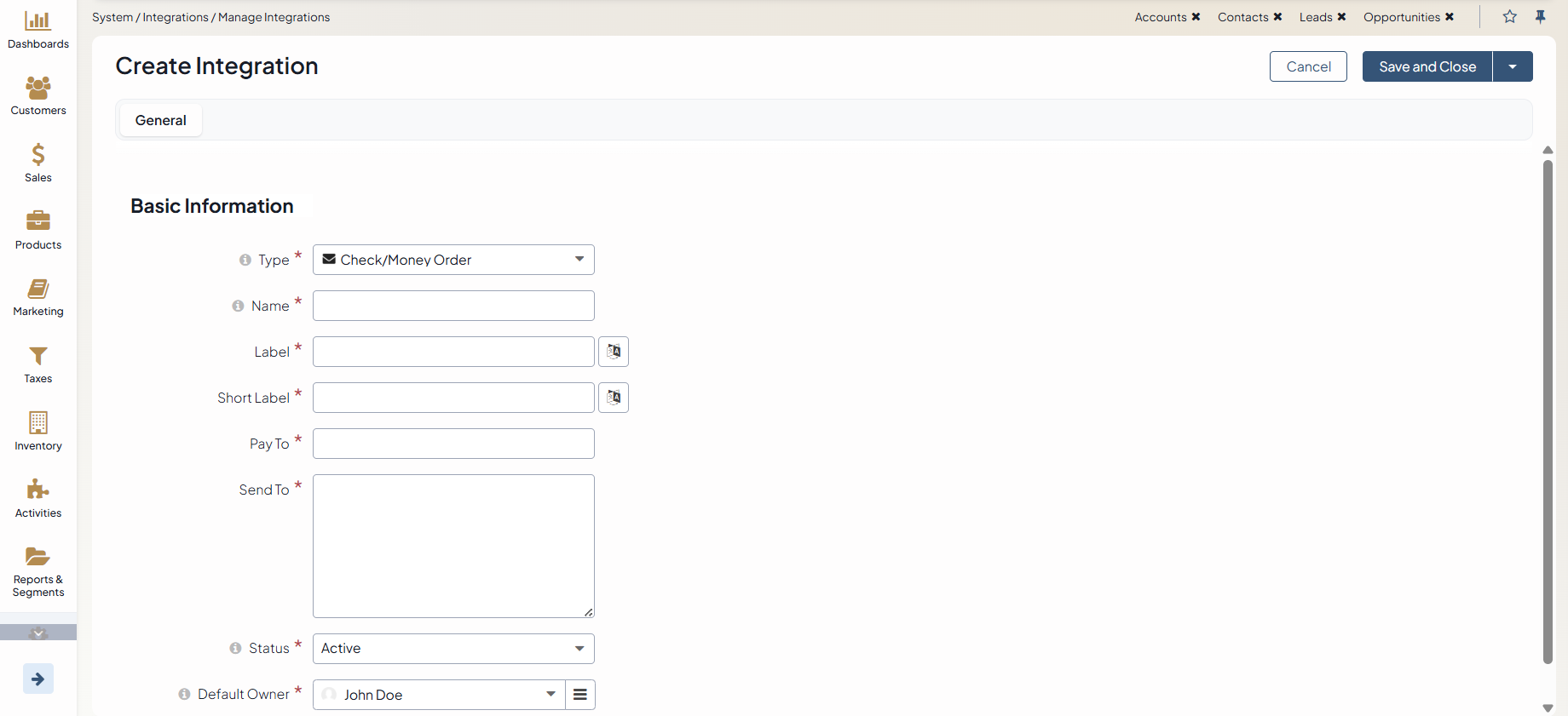 Configure Check/Money Order Integration under System > Integrations > Manage Integrations to enable check/money order as a payment method in the system.