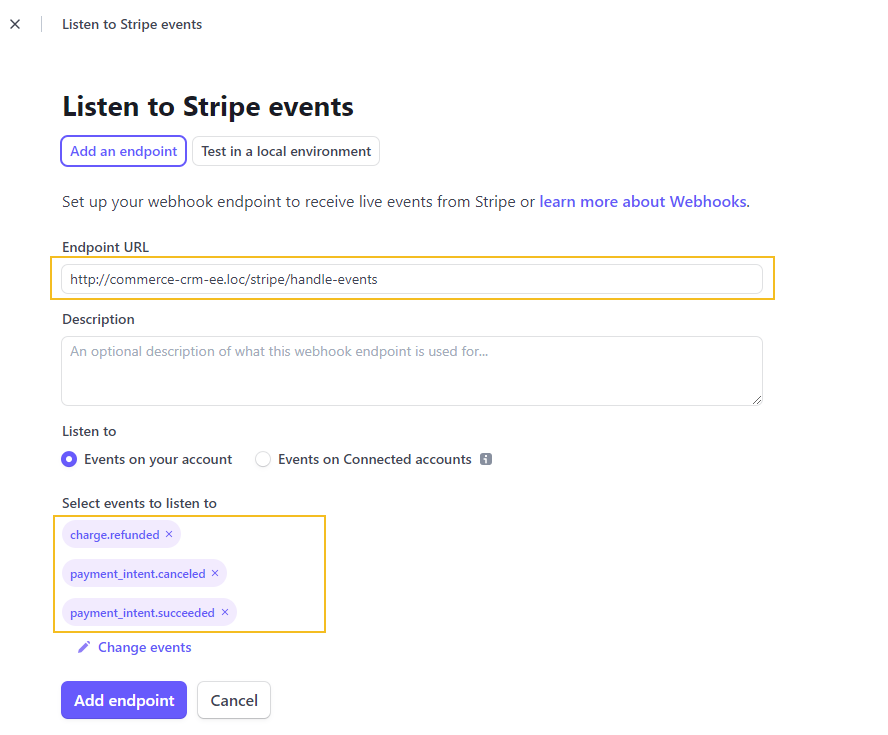 Provide the endpoint URL and select the three events to listen to, charge.refunded, payment_intent.canceled, and payment_intent.succeeded. Keep in mind that Oro supports only these three events. Click Add events.