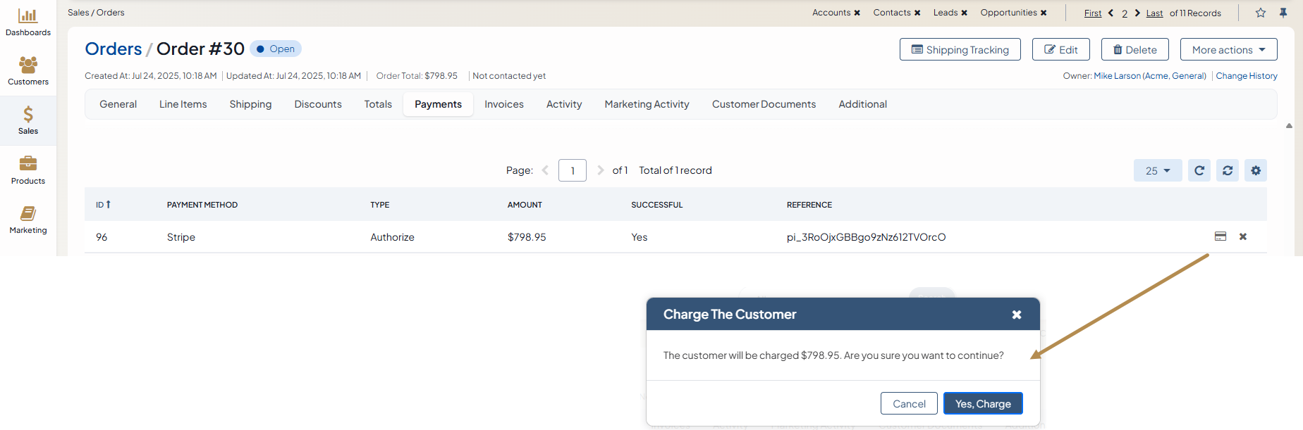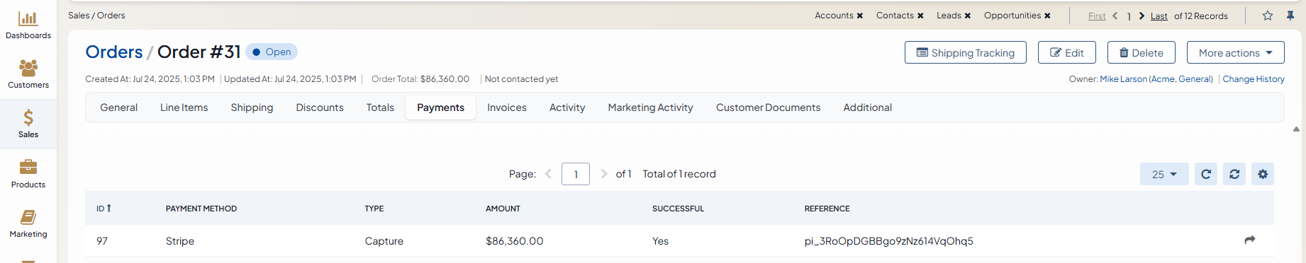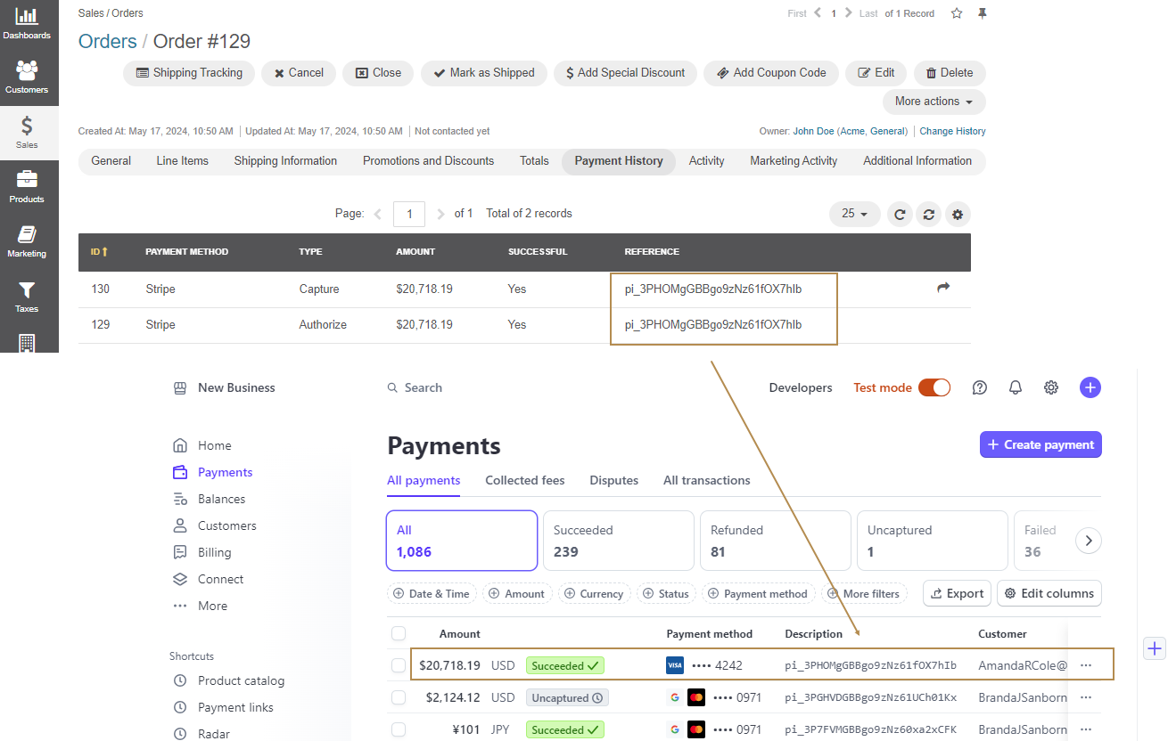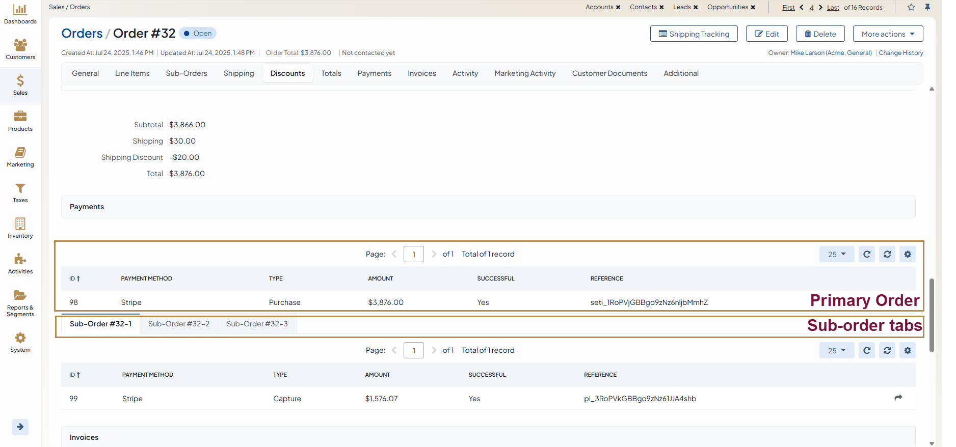 Once submitted, the system splits the order to the respective sub-orders, assigning them the corresponding reference codes. The codes are used to identify the order on the Stripe side. You can find the details on the primary or sub-order details page, under the Payments section.