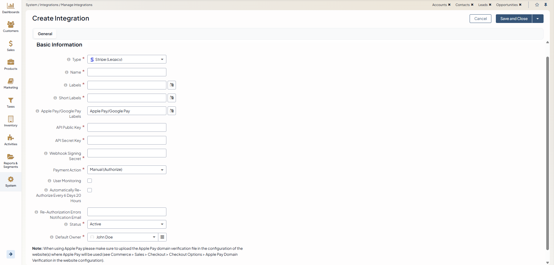 To configure the integration between Stripe and OroCommerce, follow the steps outlined below: