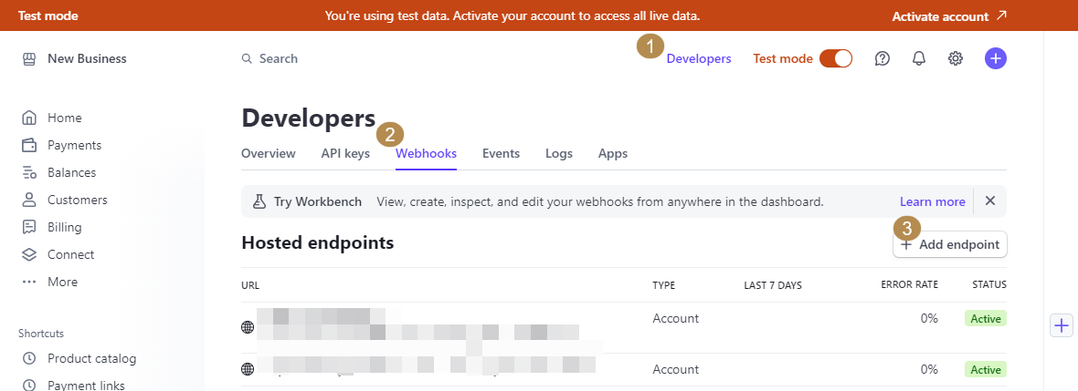 https://my_website_domain.com/stripe/handle-events. You can use one endpoint to handle several different event types at once, or set up individual endpoints for specific events.![]()