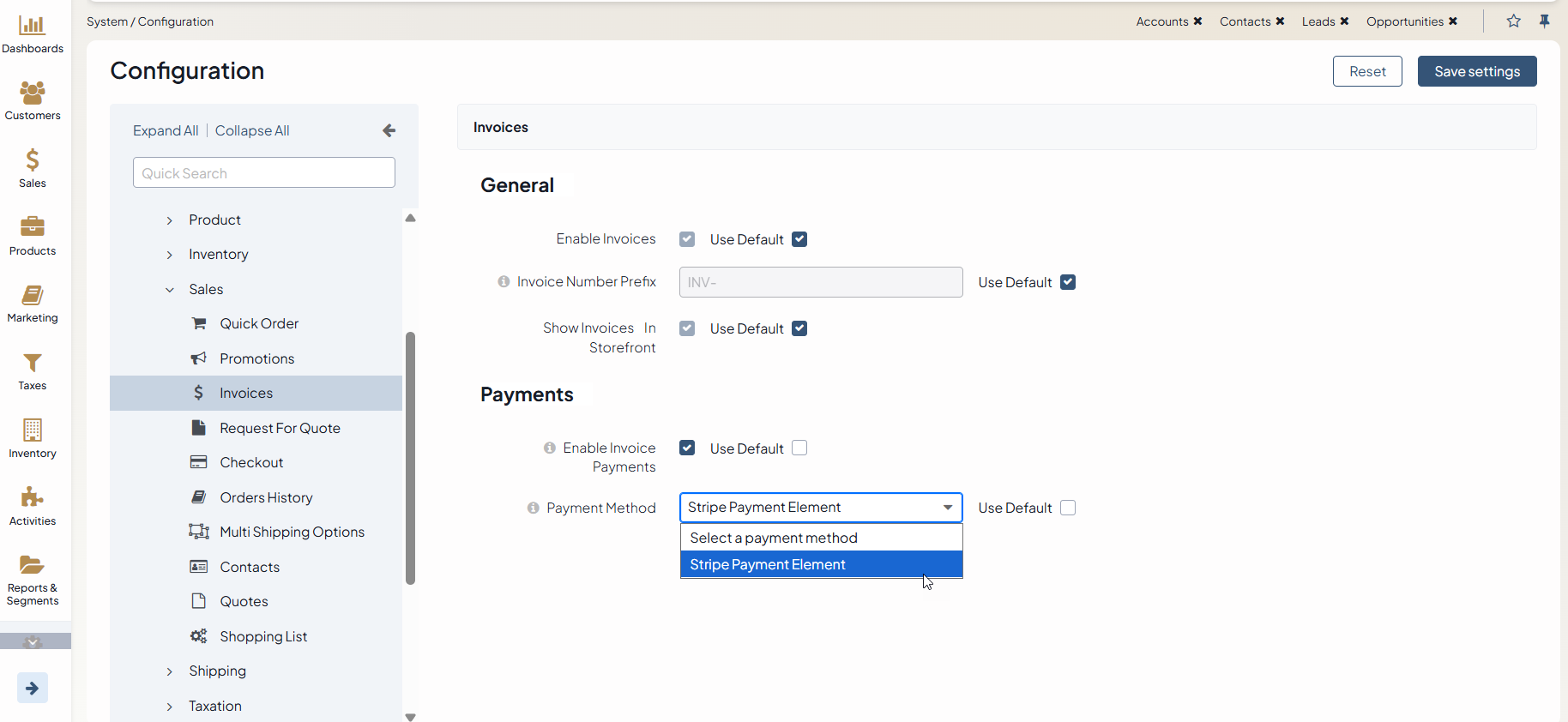 Once the integration is saved, connect it as a payment method in the configuration settings for Invoices: