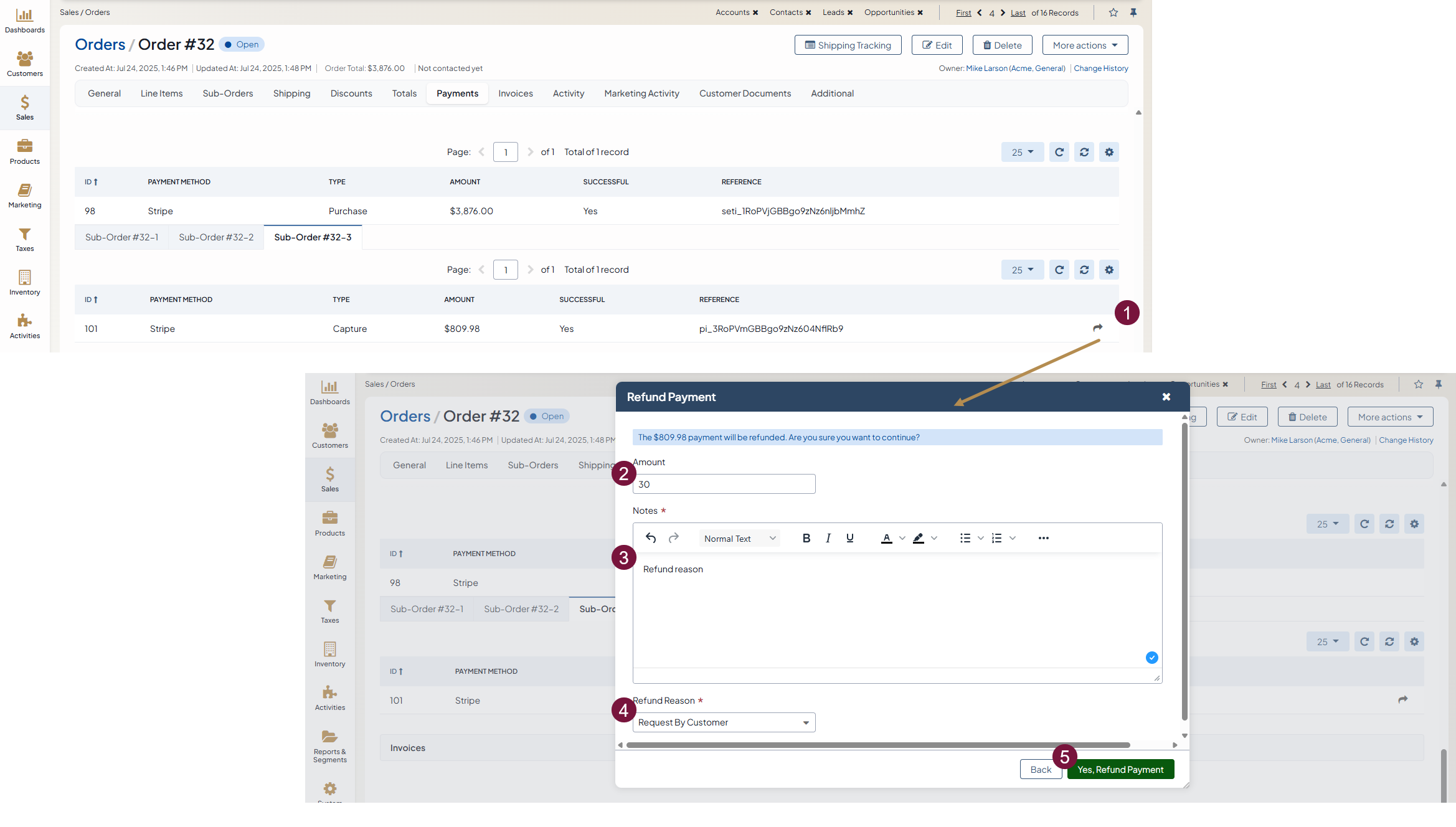 From the primary order details page — Select the sub-order tab under the Sub-Orders Payment History menu and click .