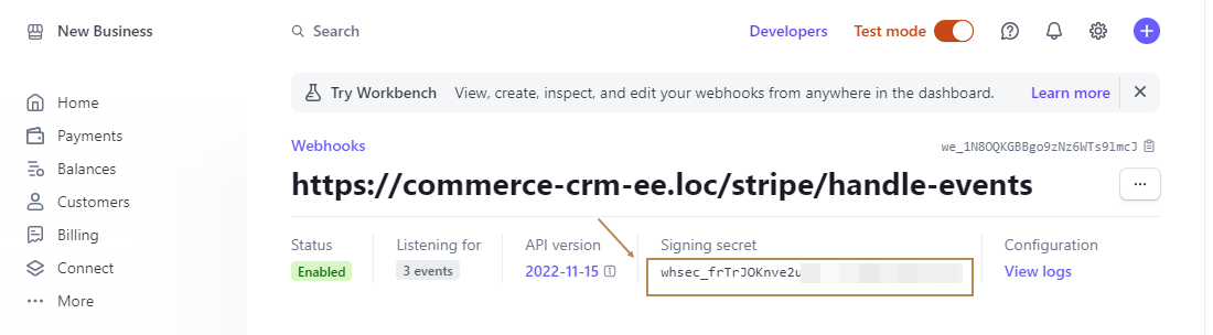 Click Add endpoint and copy the generated Signing secret to your Stripe integration creation field.