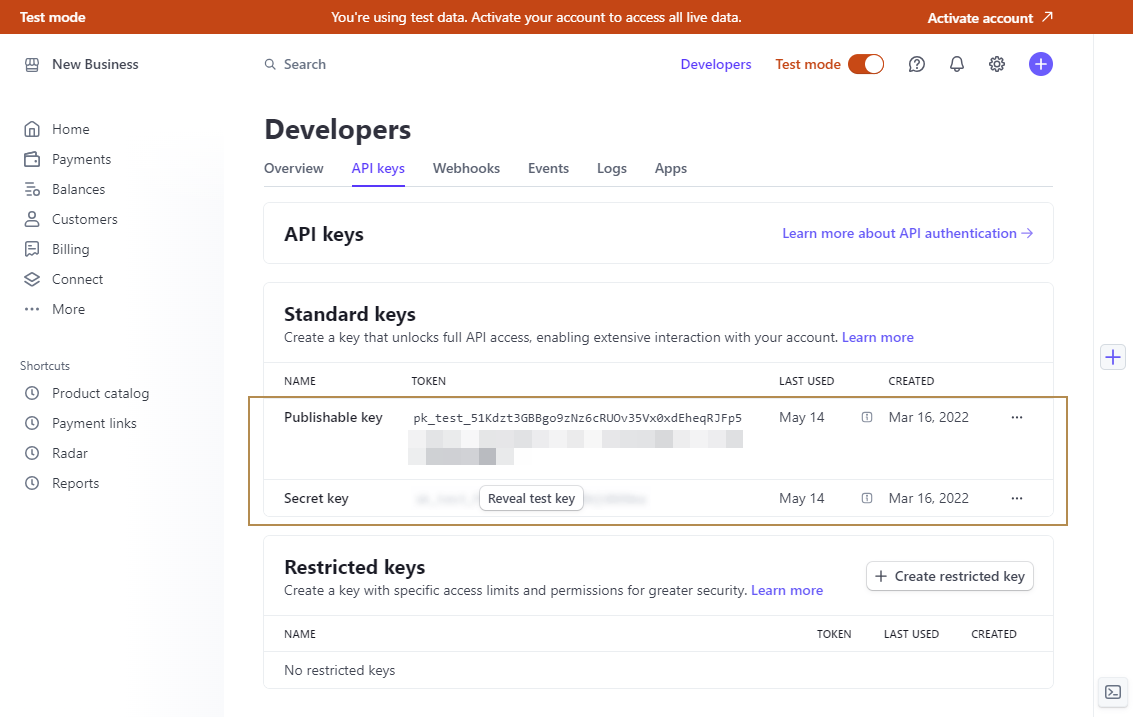 API Public Key - An identifier that helps authenticate your account. It refers to Publishable key on the Stripe side. You must use separate keys for the test and production environments.