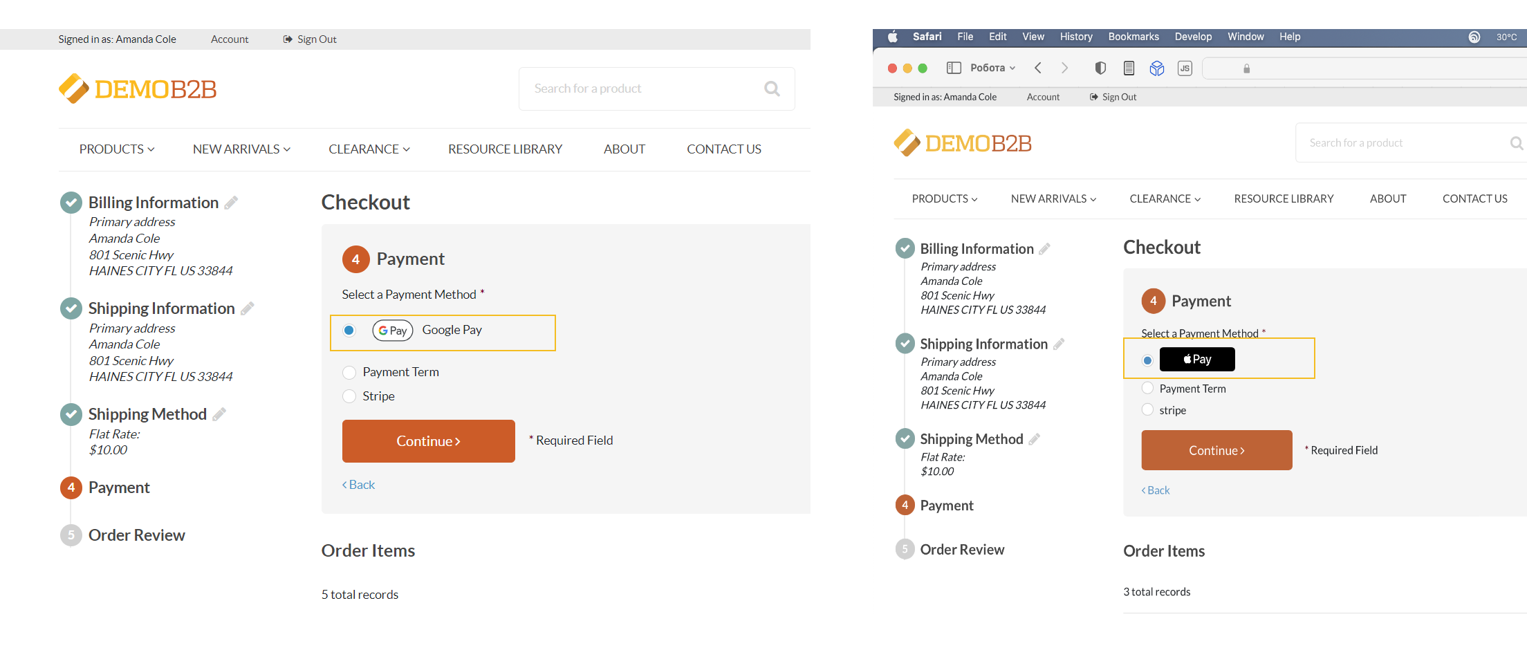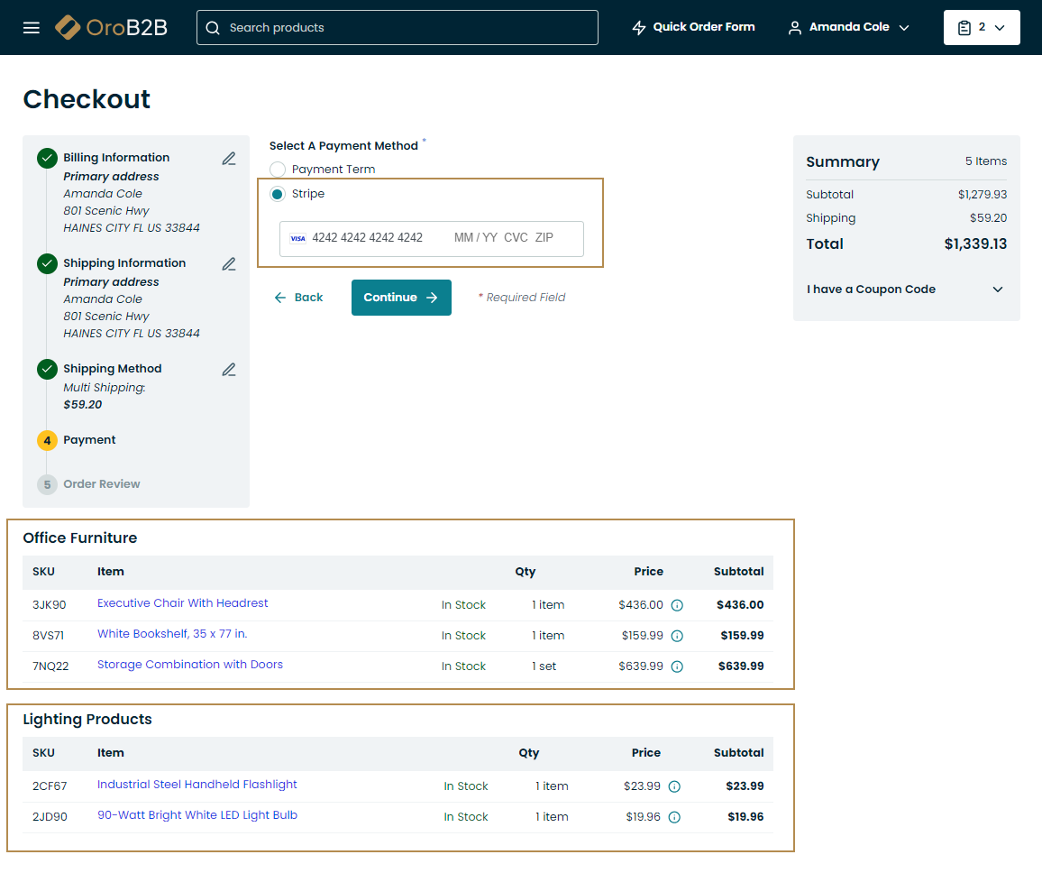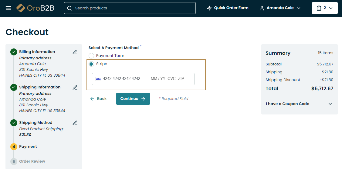 Once the payment methods are linked to a payment rule, they become available at checkout in the OroCommerce storefront.