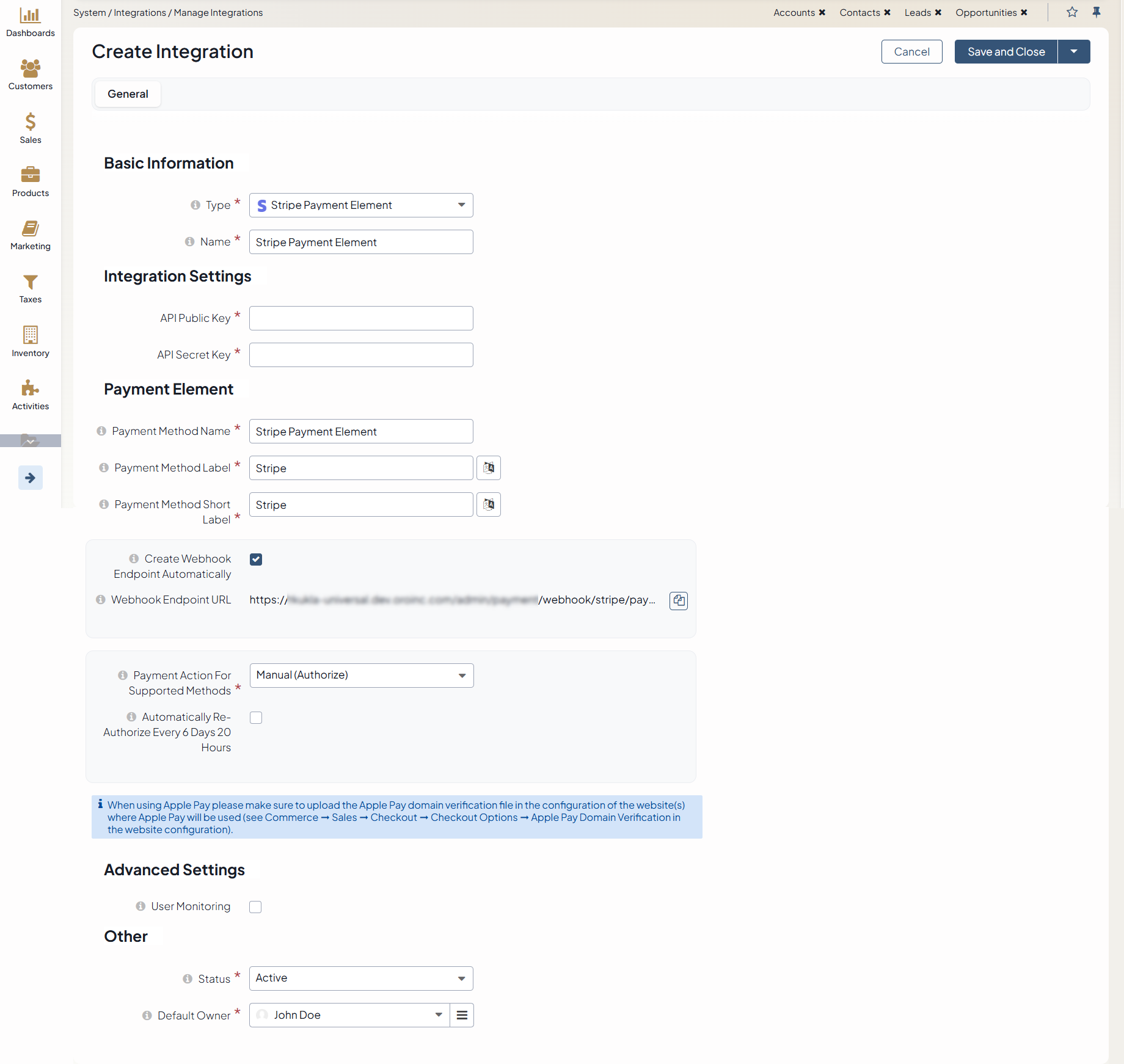 Create a Stripe Integration Element integration under System > Manage Integrations.