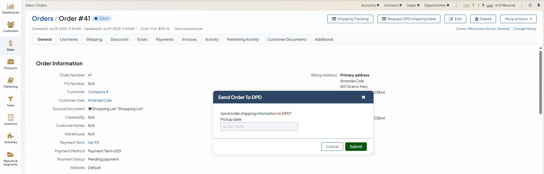 To obtain a shipping label for the package, click Request DPD Shipping Label on the order view page. In the pop-up dialog, click Submit to send order shipping information and pick up date to DPD.