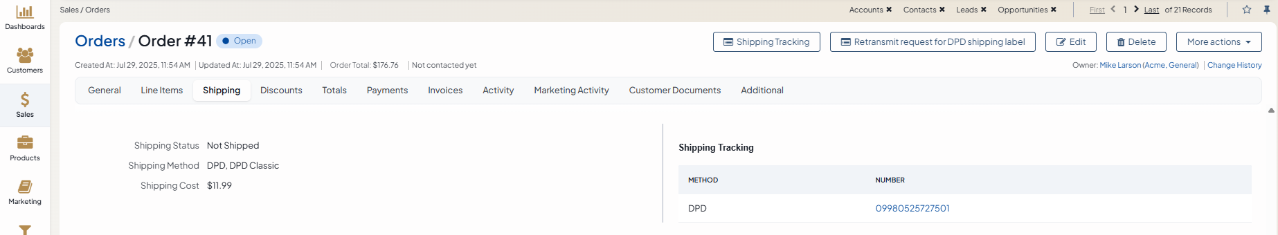 Details of all orders submitted from the OroCommerce storefront, are synced into the OroCommerce back-office, where you can update and adjust order information when necessary, capture payments and manage order shipping. Among a variety of actions available through the order view pages, you can request DPD shipping labels, retransmit shipping label requests, and download a pdf of the shipping label.