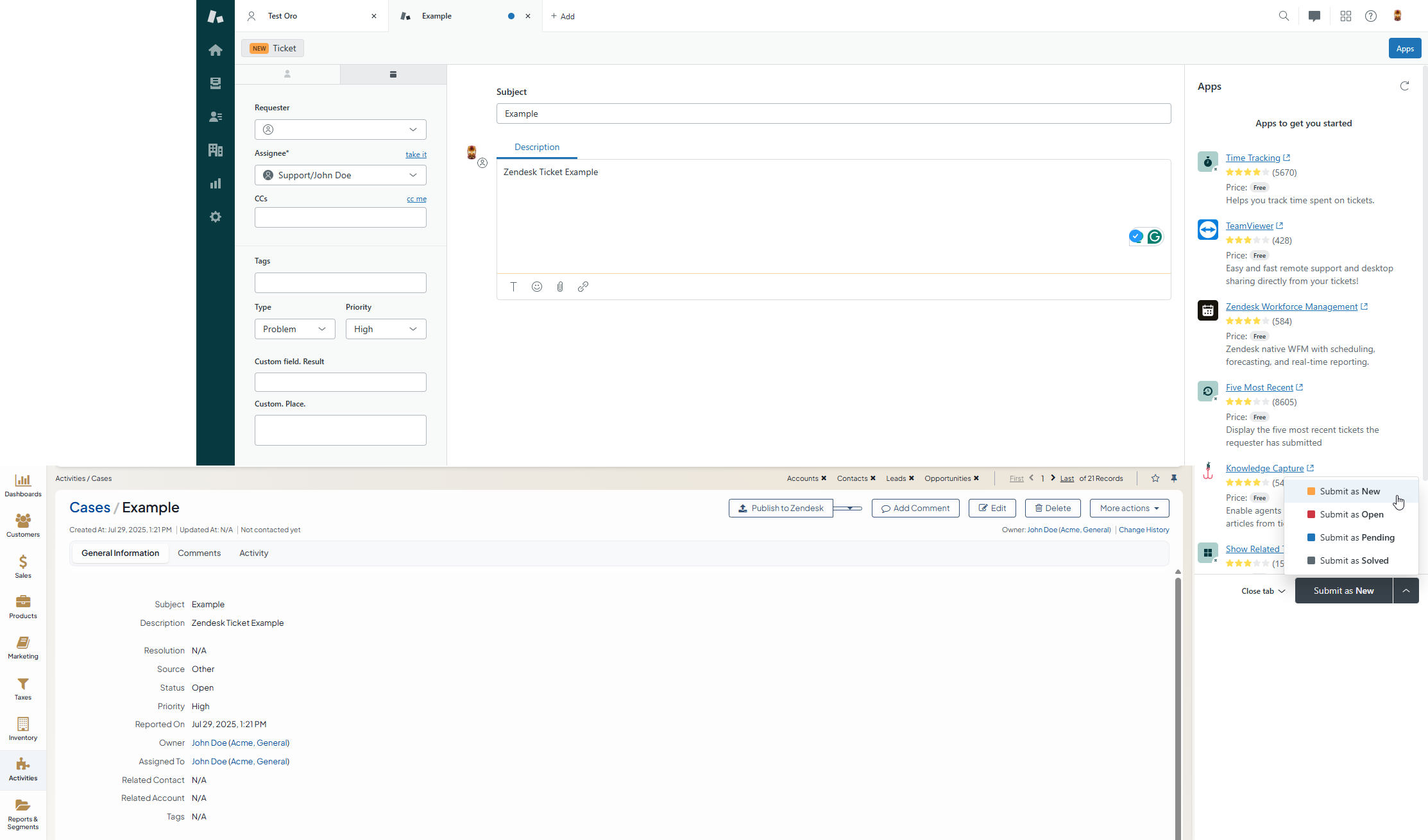After the ticket has been created in Zendesk, its details are saved in the Ticket related to the case in the Oro application.